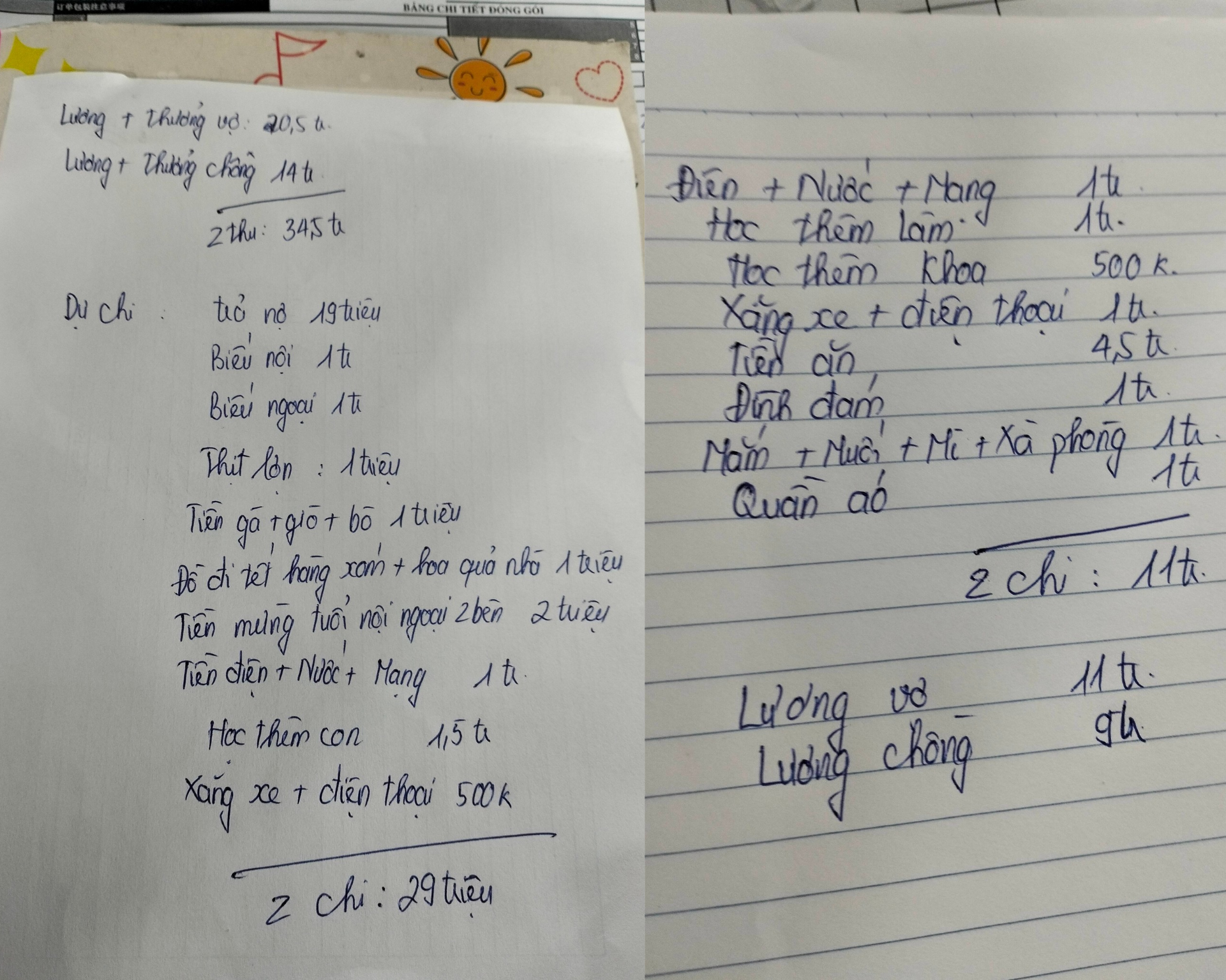 Tuy vậy, cũng xuất hiện những thắc mắc xoay quanh các khoản chi cho con cái, đặc biệt là chi phí học tập và sinh hoạt hằng ngày, khi bảng chi tiêu được cho là khá gọn nhẹ so với thực tế của nhiều gia đình khác.