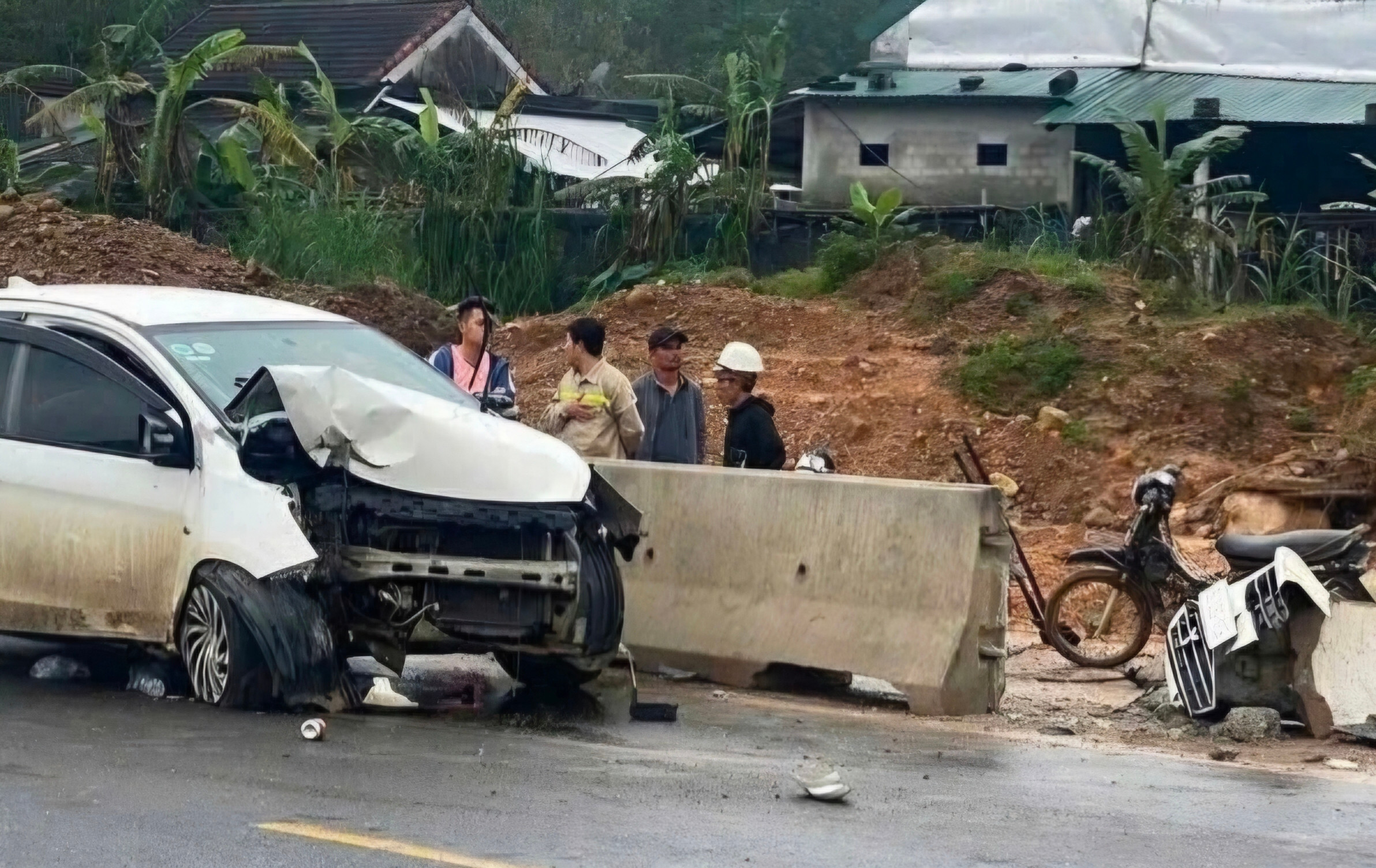 Tại hiện trường, ô tô hư hỏng nặng phần đầu. Có dấu hiệu cho thấy xe đã tông vào khối bê tông ở bên lề đường.