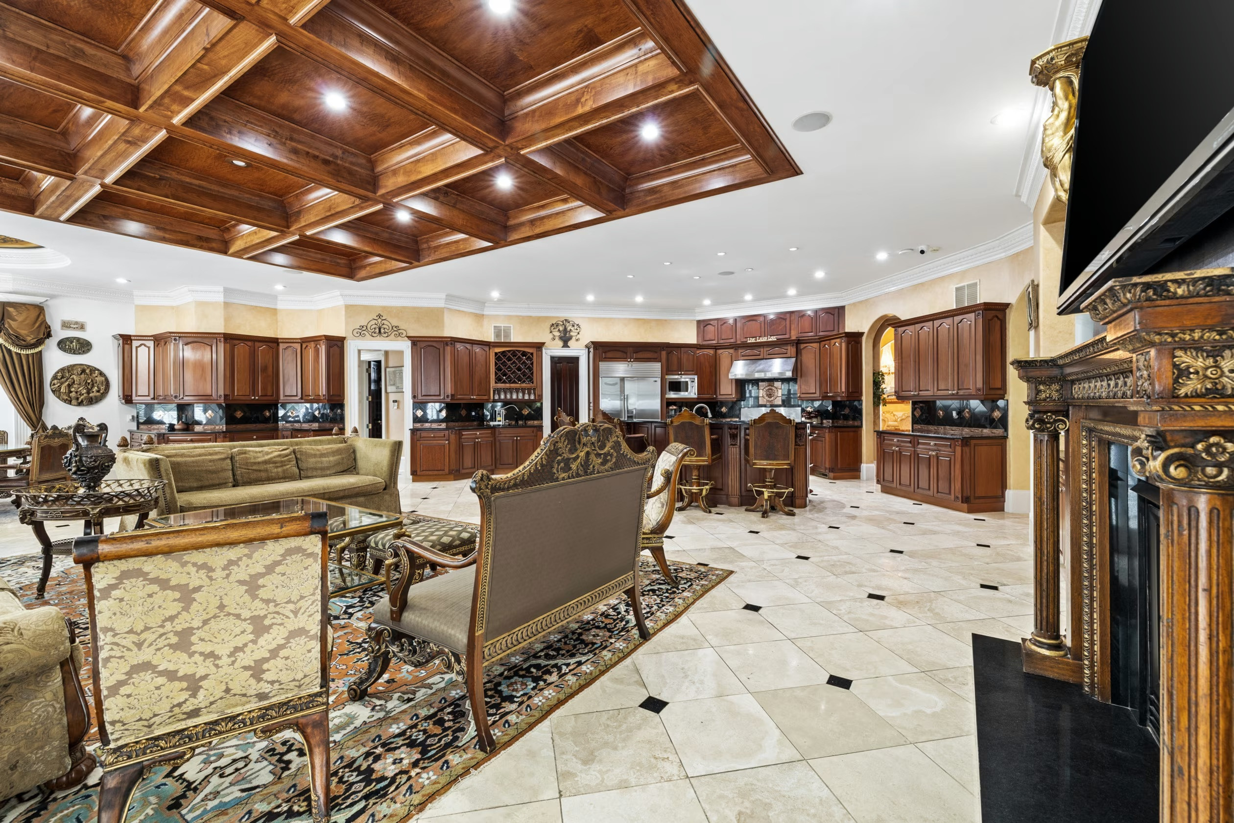 Bên trong, sảnh chính gây ấn tượng với trần vẽ tranh tường, cầu thang lớn uốn cong và đèn chùm thiết kế riêng, tất cả được kết nối bằng một thang máy âm tường. Không gian bên ngoài gồm khu vườn được cắt tỉa tỉ mỉ, hồ bơi cỡ lớn và bể jacuzzi, cùng một nhà phụ đầy đủ tiện nghi với bếp ngoài trời.