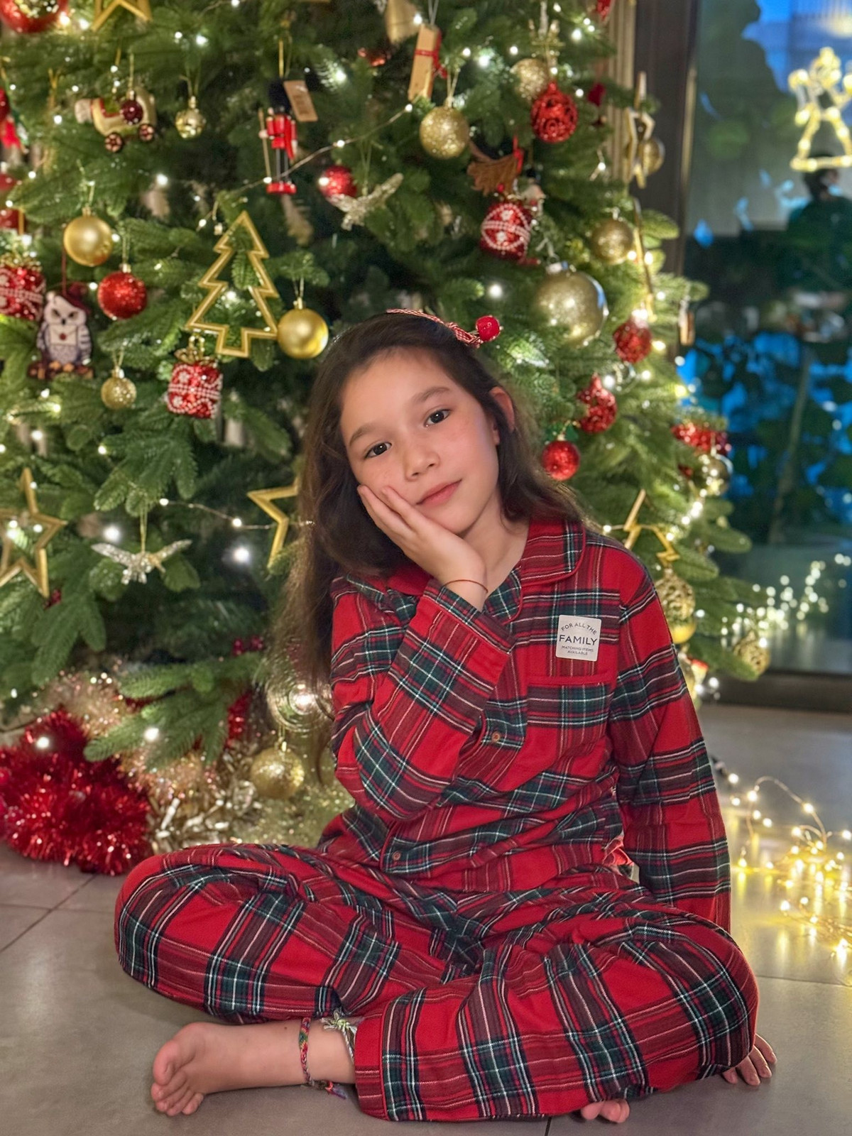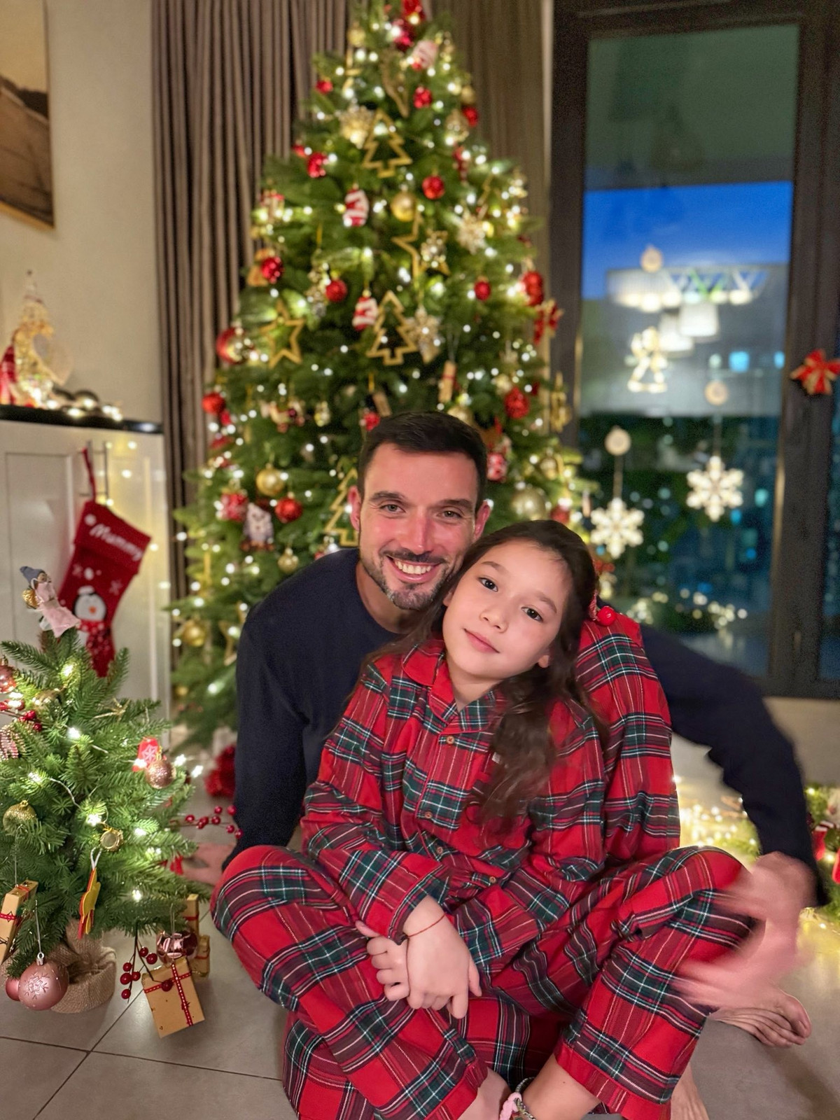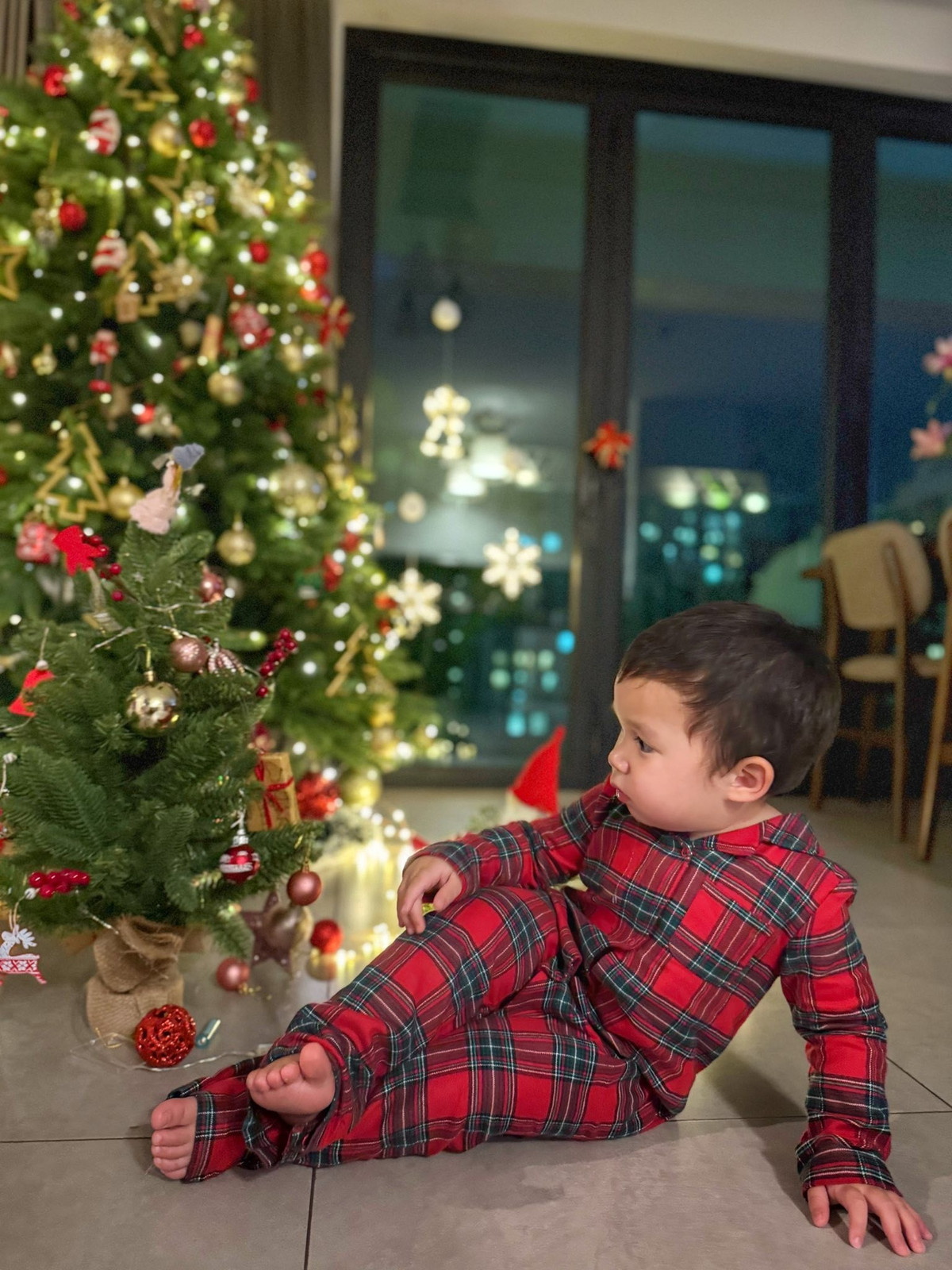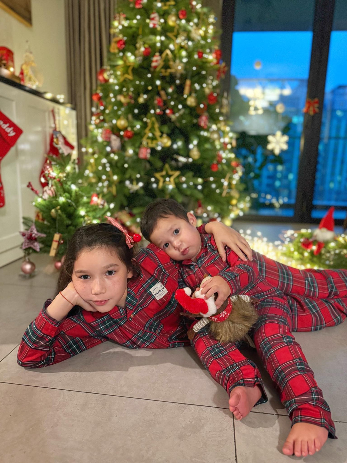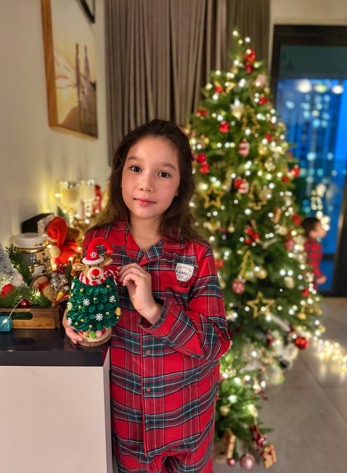 Không gian phòng khách nhà Hà Anh nhanh chóng biến thành “góc lễ hội” với cây thông lớn, dây đèn màu rực rỡ và những món đồ trang trí lấp lánh.