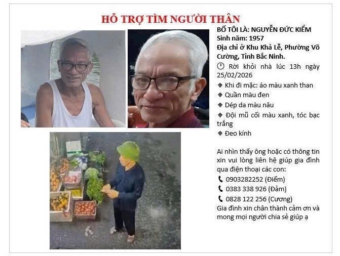 Gia đình chúng tôi tìm kiếm bố tôi là Nguyễn Đức Kiểm, sinh năm 1957 (Địa chỉ: Khu Khả Lễ, phưỡng Võ Cường, tỉnh Bắc Ninh).