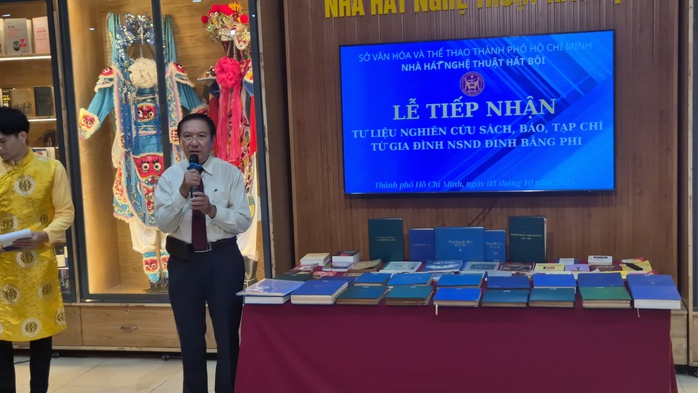 NSƯT Nguyễn Hoàng Vinh - Giám đốc Nhà hát Nghệ thuật Hát bội TP HCM, đại diện Nhà hát tiếp nhận nguồn tư liệu quý gồm tư liệu nghiên cứu, sách, báo… từ gia đình NSND Đinh Bằng Phi.