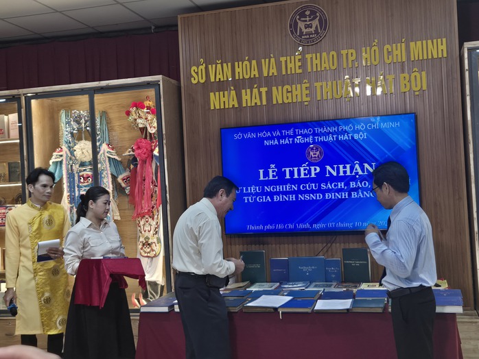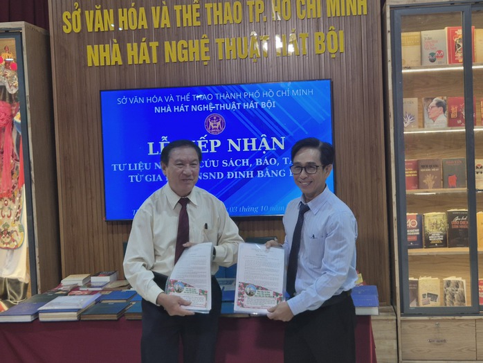 Ngày 3-10, nhân dịp Giỗ Tổ sân khấu Việt Nam 2025, gia đình NSND Đinh Bằng Phi mà đại diện là ông Đinh Thành Tâm (nguyên Hiệu trưởng Trường THPT Dương Văn Dương, xã Nhà Bè, TP HCM) trao tặng tư liệu quý NSND Đinh Bằng Phi dày công biên soạn, lưu giữ suốt nhiều thập kỷ cho Nhà hát Nghệ thuật Hát bội TP HCM.
