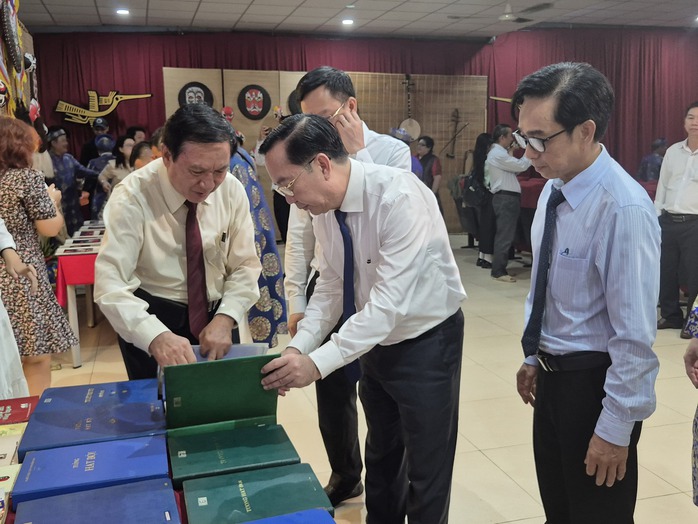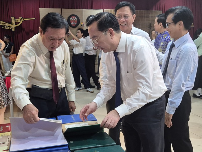 Ông Đinh Thành Tâm (trái) giới thiệu cho ông Trần Thế Thuận - Giám đốc Sở Văn hóa Thể thao TP HCM những tư liệu mà ba ông trao tặng