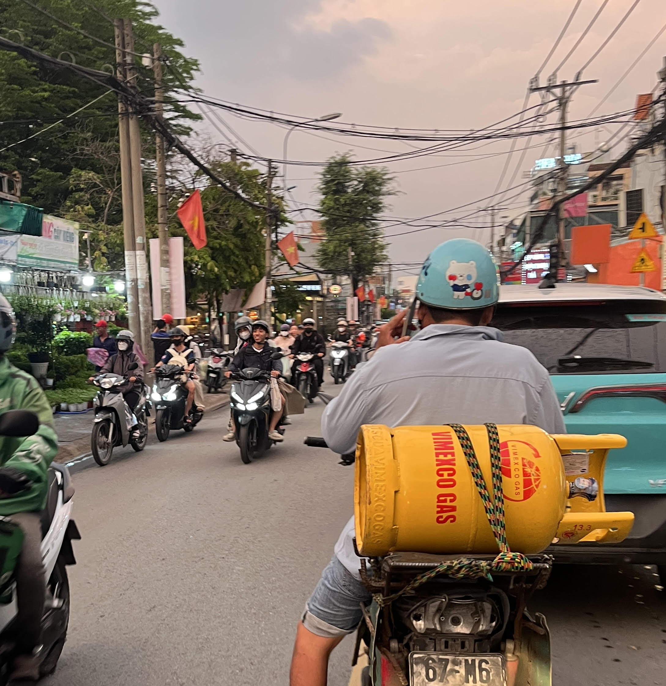 Nhân viên một công ty giao gas trong chiều 7-3. Ảnh: TÚ UYÊN