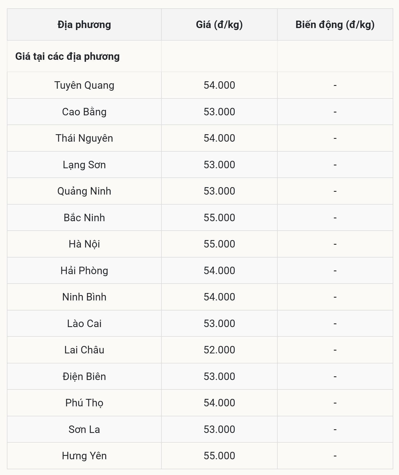 Vùng biên giới và miền núi như Cao Bằng, Lạng Sơn, Quảng Ninh, Lào Cai, Sơn La, Điện Biên neo ở mức 53.000 đồng/kg, trong khi Lai Châu giữ vị trí thấp nhất khu vực với 52.000 đồng/kg.
