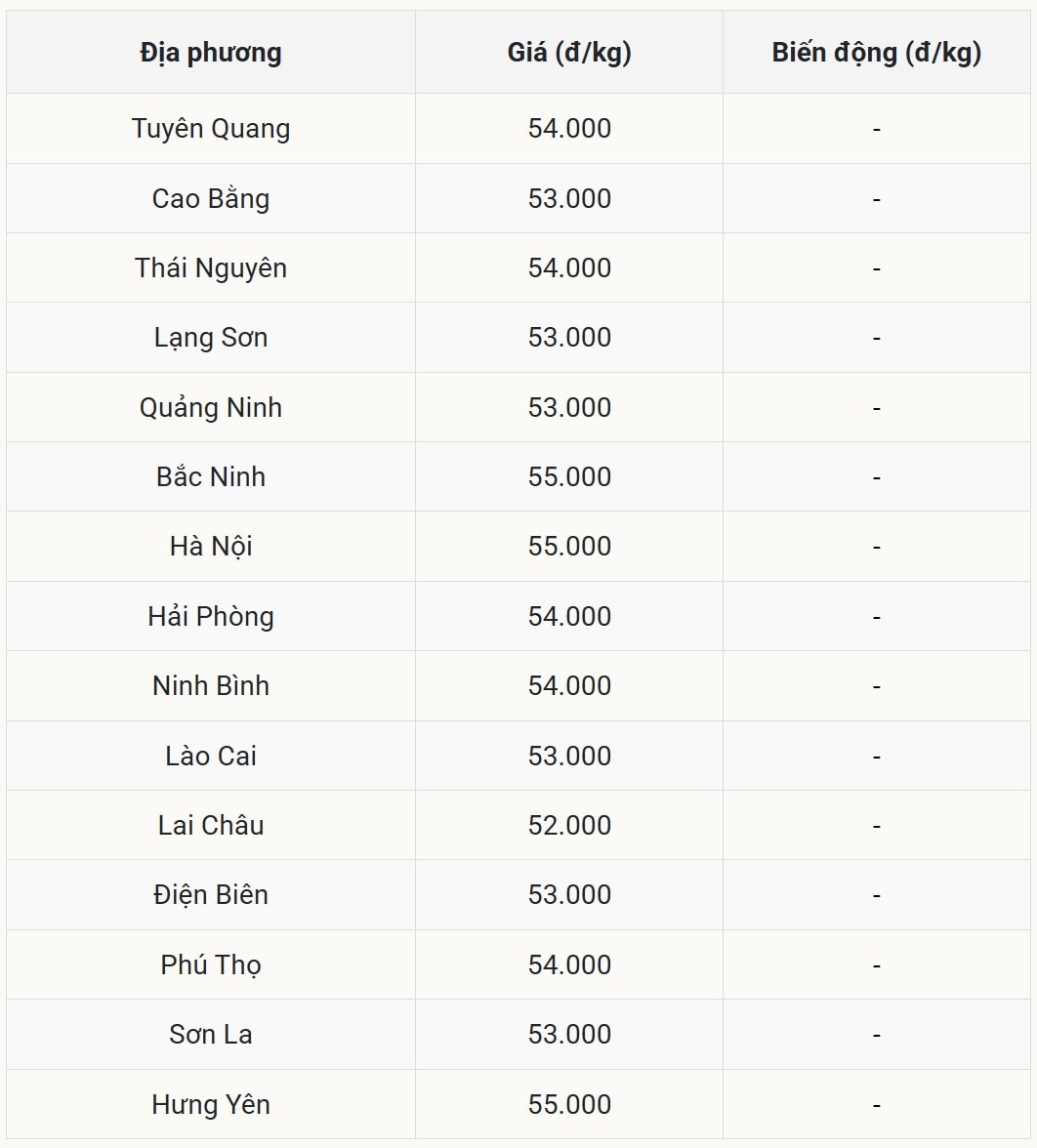Một loạt các tỉnh như Tuyên Quang, Thái Nguyên, Hải Phòng, Ninh Bình và Phú Thọ áp dụng mức giá phổ biến 54.000 đồng/kg.