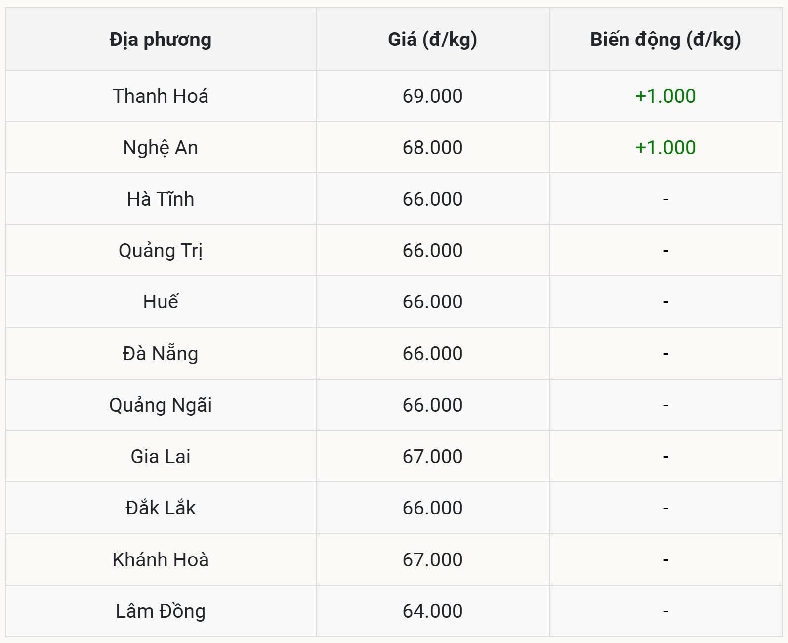 Tại khu vực miền Trung – Tây Nguyên, thị trường cũng ghi nhận xu hướng đi lên nhẹ. Hai tỉnh Thanh Hóa và Nghệ An cùng tăng 1.000 đồng/kg, trong đó Thanh Hóa đạt 69.000 đồng/kg – mức cao nhất khu vực, còn Nghệ An chạm mốc 68.000 đồng/kg.