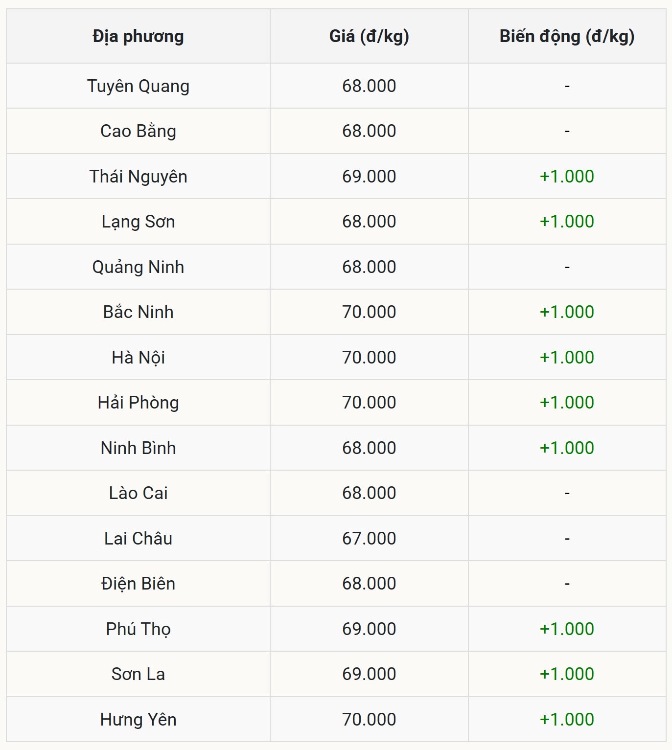 Khảo sát tại khu vực miền Bắc cho thấy giá heo hơi tiếp tục nhích lên tại nhiều tỉnh, thành trọng điểm. Cụ thể, sau khi điều chỉnh tăng 1.000 đồng/kg, các địa phương bao gồm Hà Nội, Hải Phòng, Bắc Ninh và Hưng Yên cùng ghi nhận mức giá 70.000 đồng/kg.