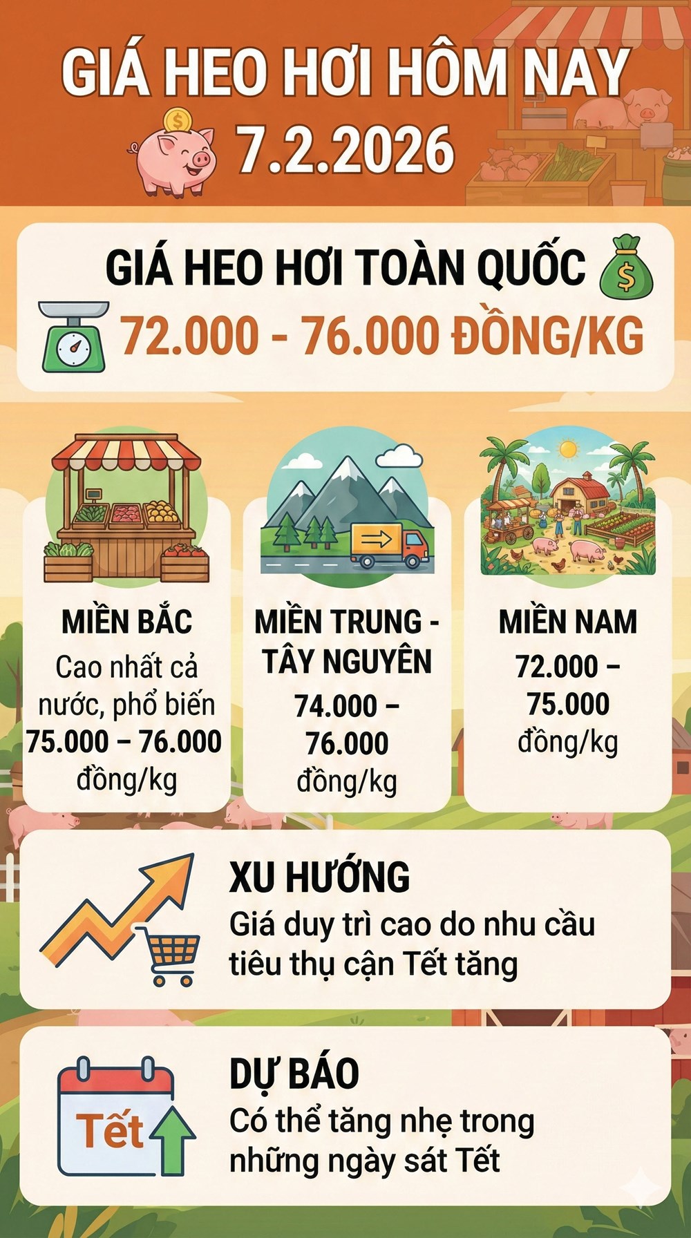 Thị trường heo hơi ngày 7.2 ghi nhận xu hướng ổn định ở mức cao trên phạm vi cả nước khi nhu cầu tiêu thụ thực phẩm phục vụ Tết Nguyên đán tăng mạnh.