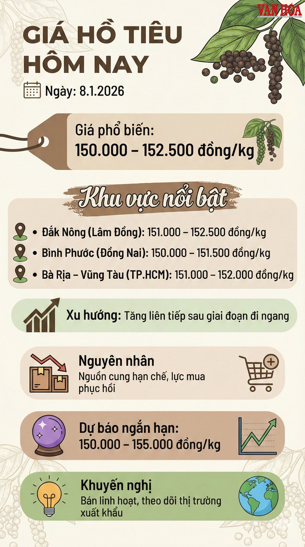 Trong bối cảnh này, người trồng tiêu được khuyến nghị bán ra theo từng đợt, tránh bán ồ ạt khi giá vừa tăng. Việc theo dõi sát diễn biến thị trường và nhu cầu xuất khẩu sẽ giúp tối ưu giá bán và hạn chế rủi ro. Thương lái và doanh nghiệp cũng cần cân nhắc chiến lược thu mua linh hoạt để thích ứng với biến động giá trong giai đoạn đầu năm.