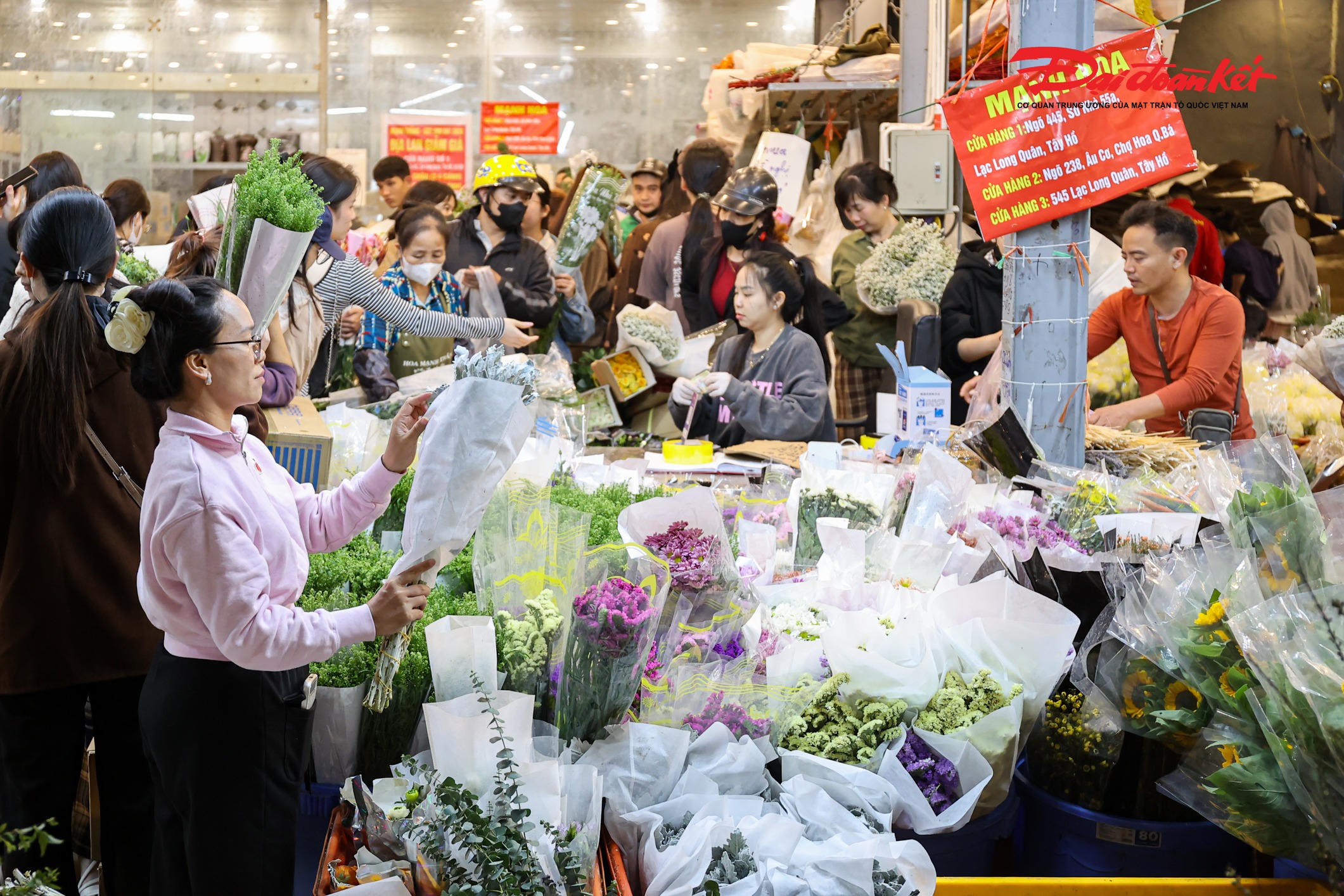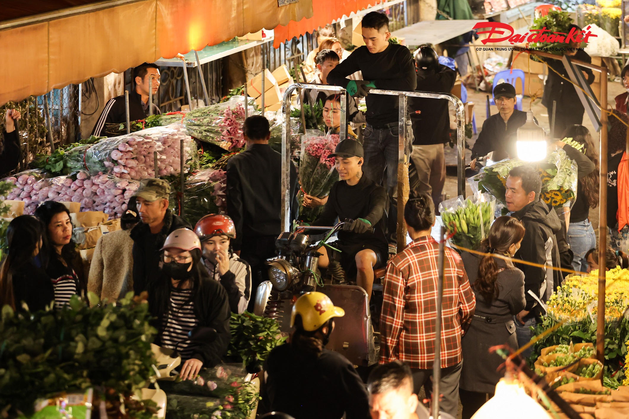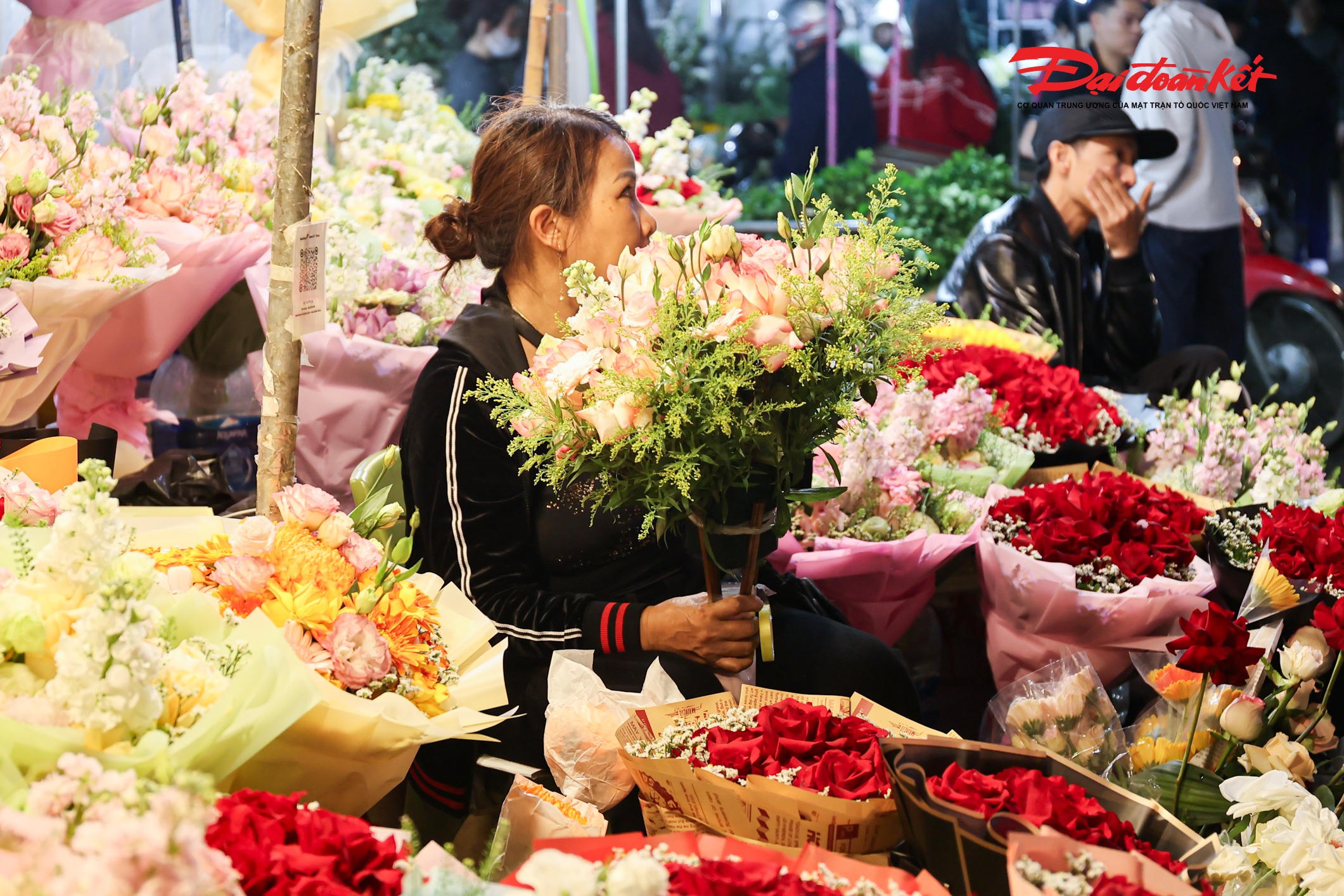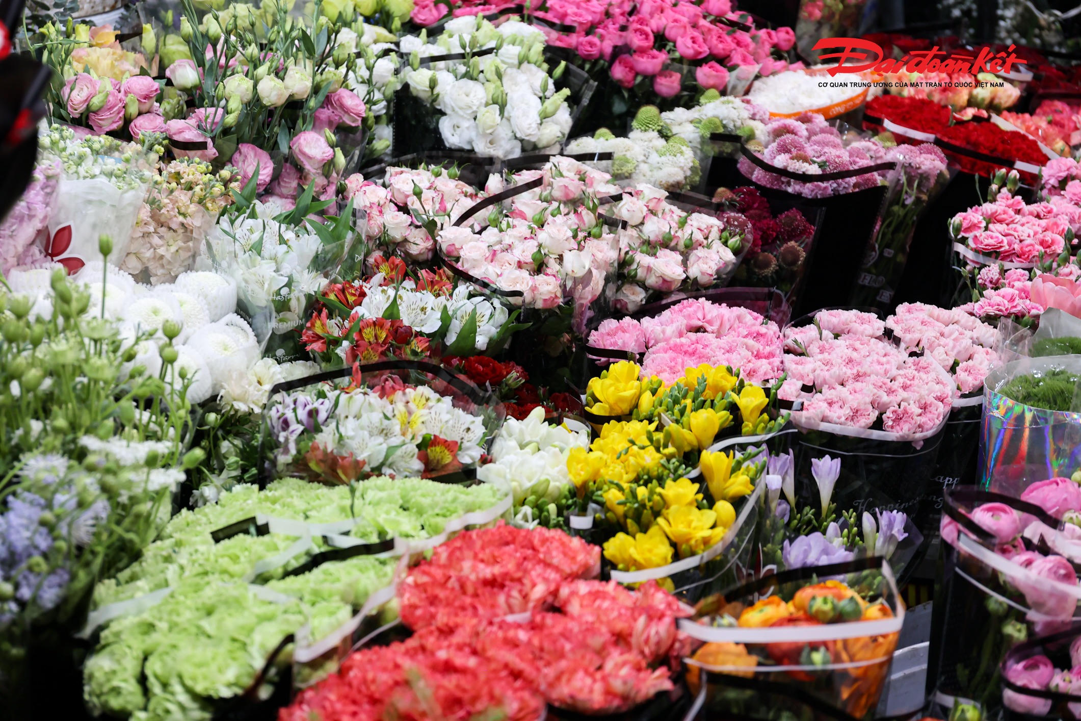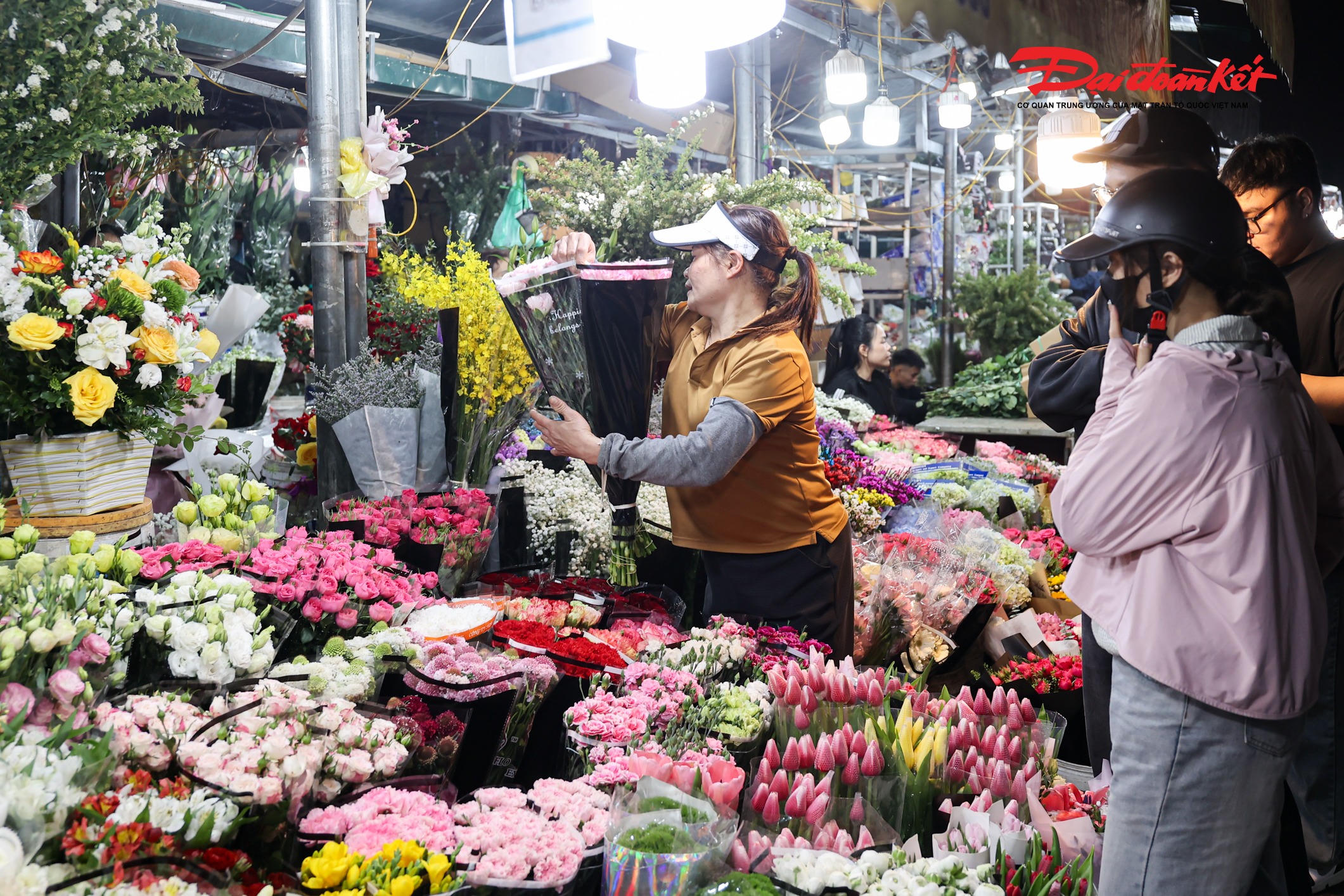 Theo ghi nhận của PV Báo Đại đoàn kết rạng sáng ngày 7/3, chợ hoa Quảng An (phường Hồng Hà, Hà Nội) trở nên rực rỡ với đủ loại hoa tươi được nhập về từ nhiều địa phương như Đà Lạt, Sơn La, Mộc Châu… Các loại hoa quen thuộc như hoa hồng, tulip, baby, ly, hướng dương được bày bán khắp các sạp, tạo nên khung cảnh đầy màu sắc giữa đêm.