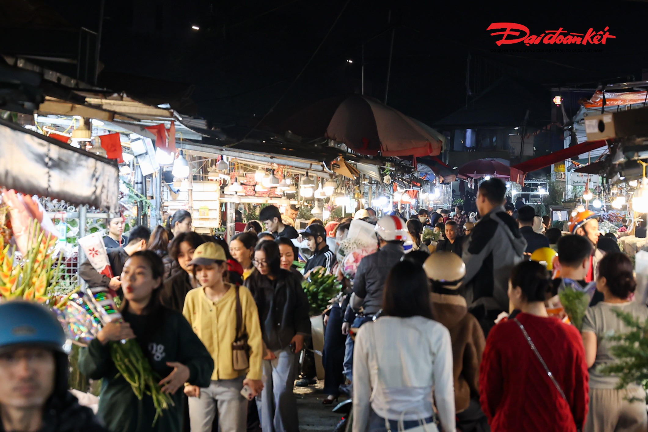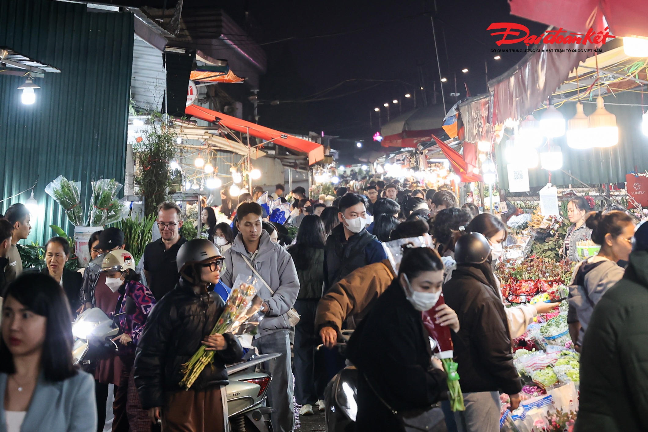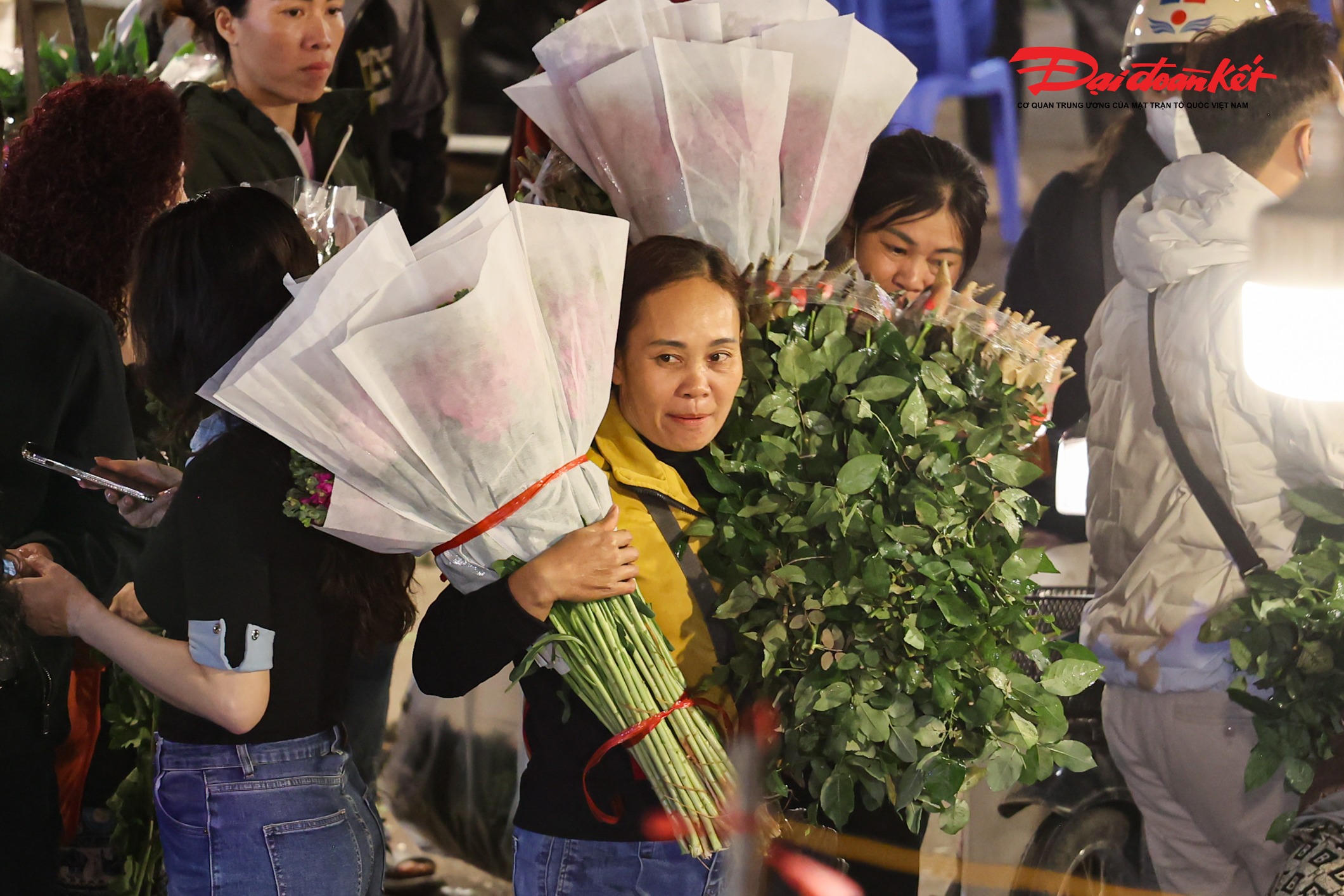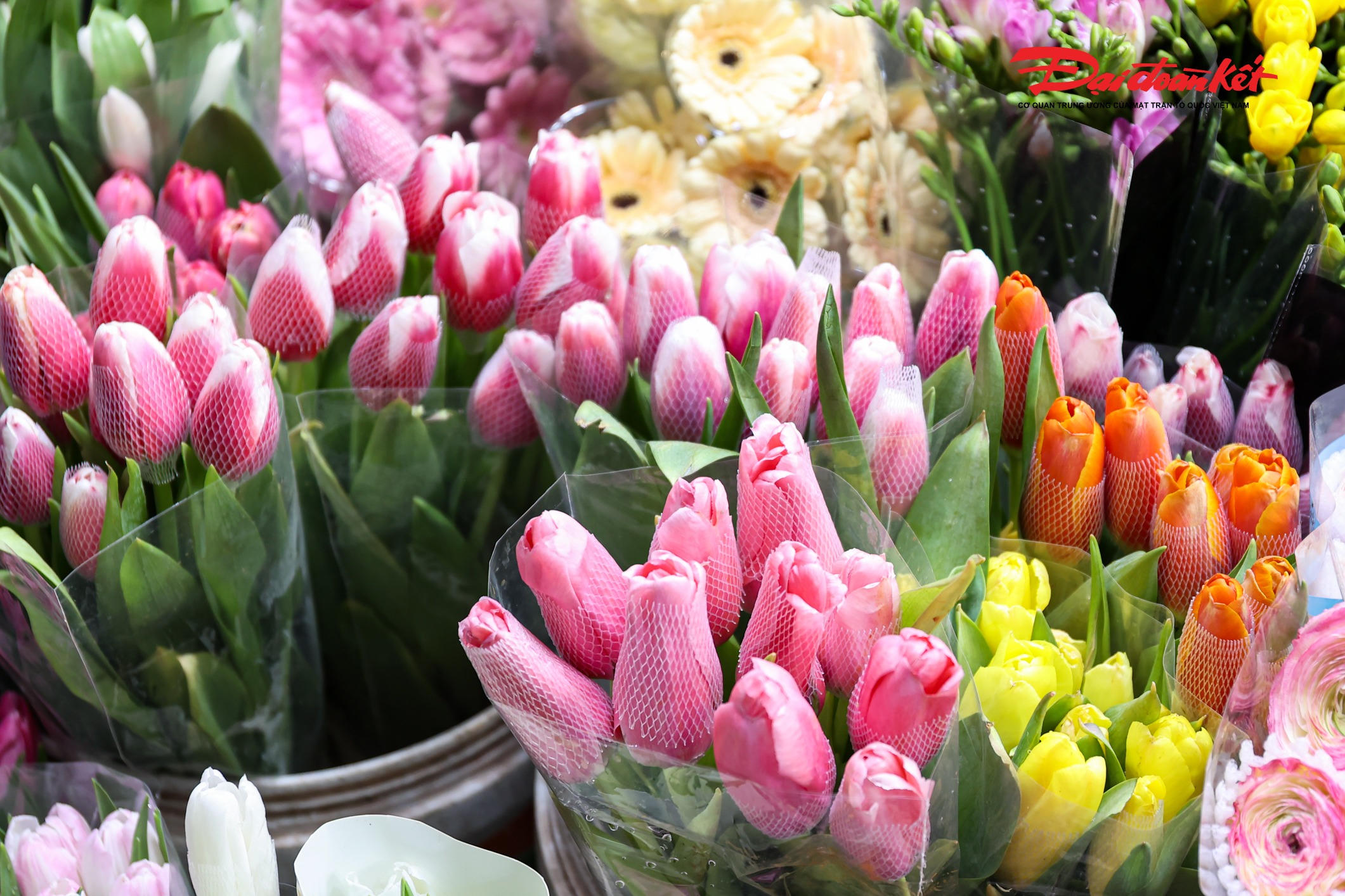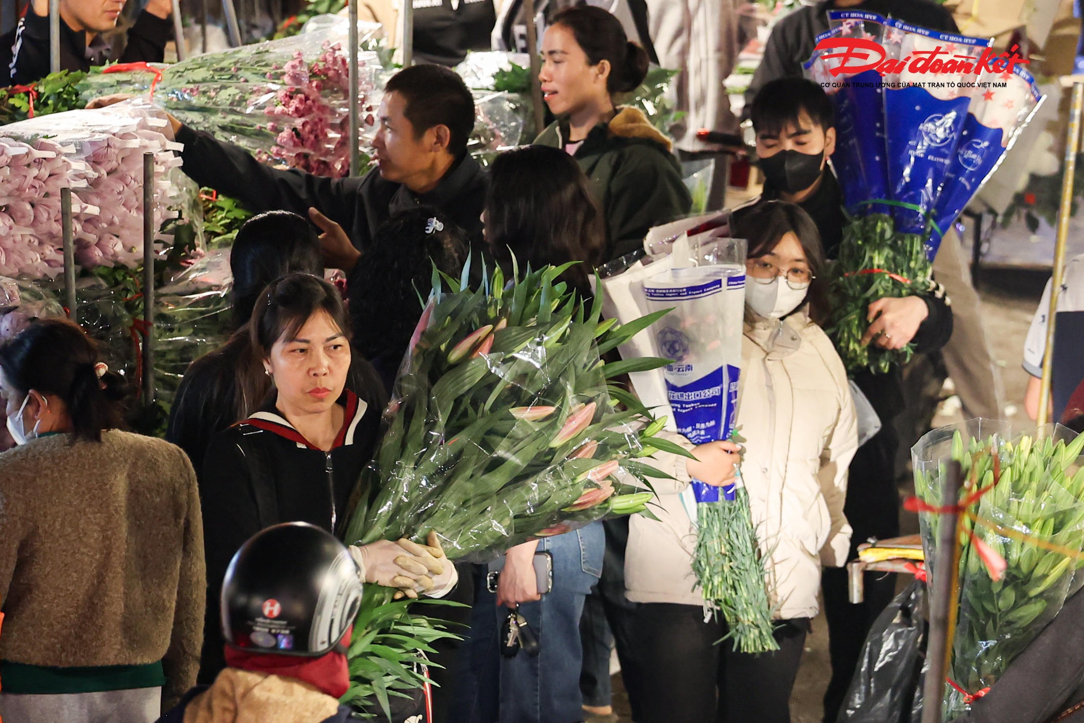 Theo ghi nhận của PV Báo Đại đoàn kết rạng sáng ngày 7/3, chợ hoa Quảng An (phường Hồng Hà, Hà Nội) trở nên rực rỡ với đủ loại hoa tươi được nhập về từ nhiều địa phương như Đà Lạt, Sơn La, Mộc Châu… Các loại hoa quen thuộc như hoa hồng, tulip, baby, ly, hướng dương được bày bán khắp các sạp, tạo nên khung cảnh đầy màu sắc giữa đêm.