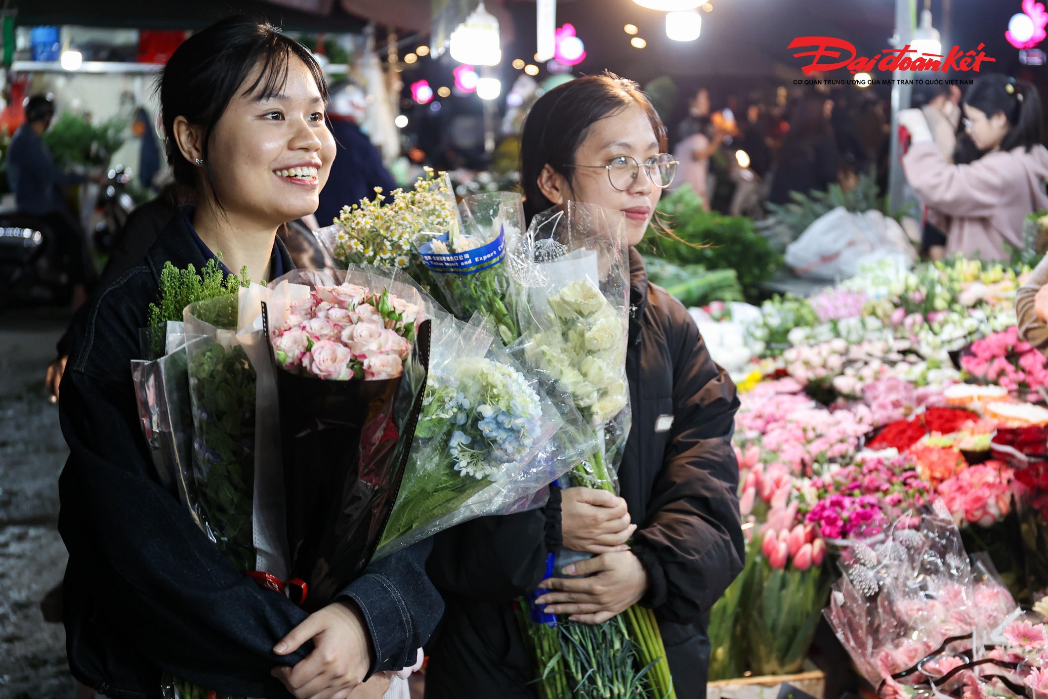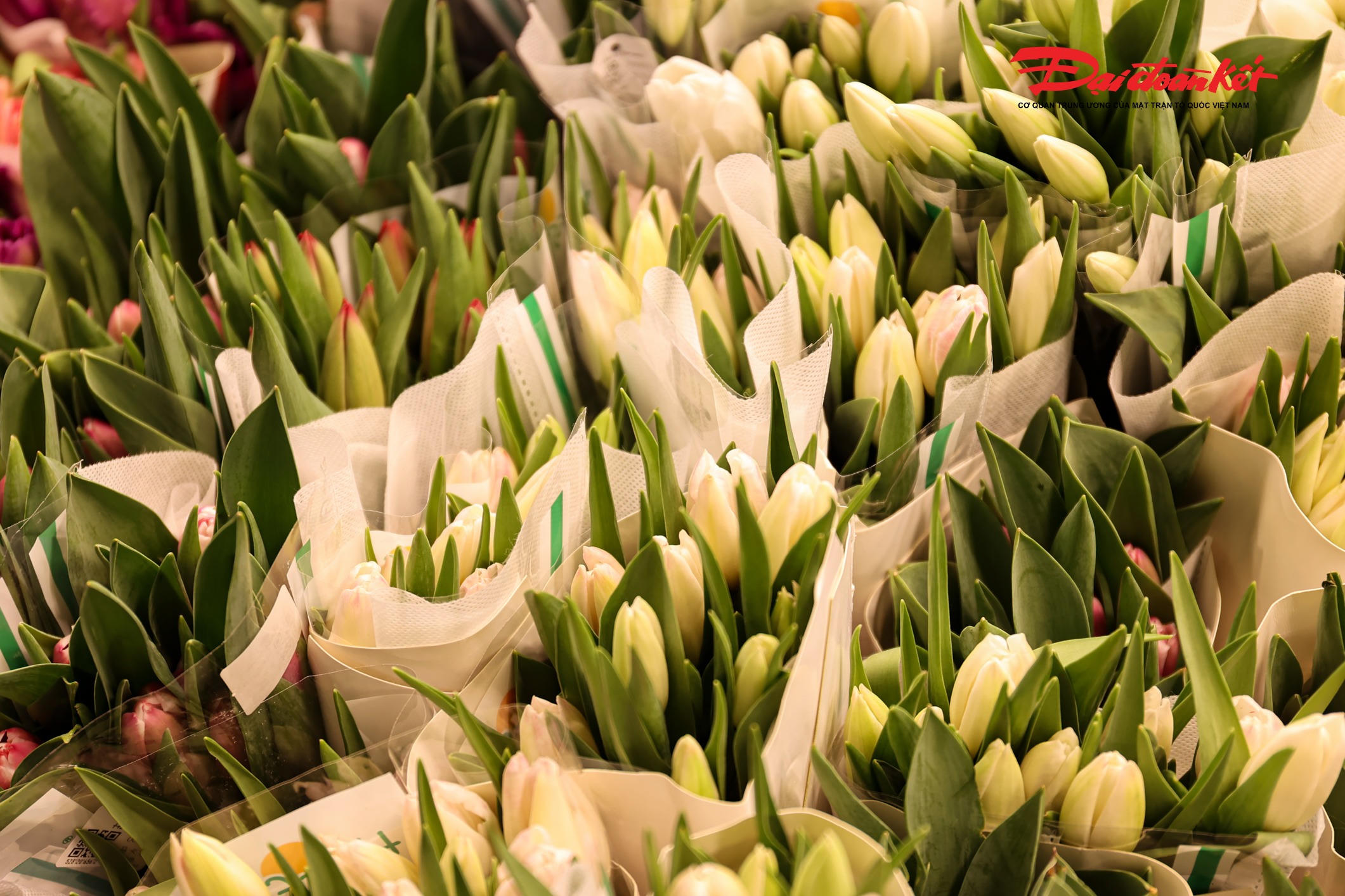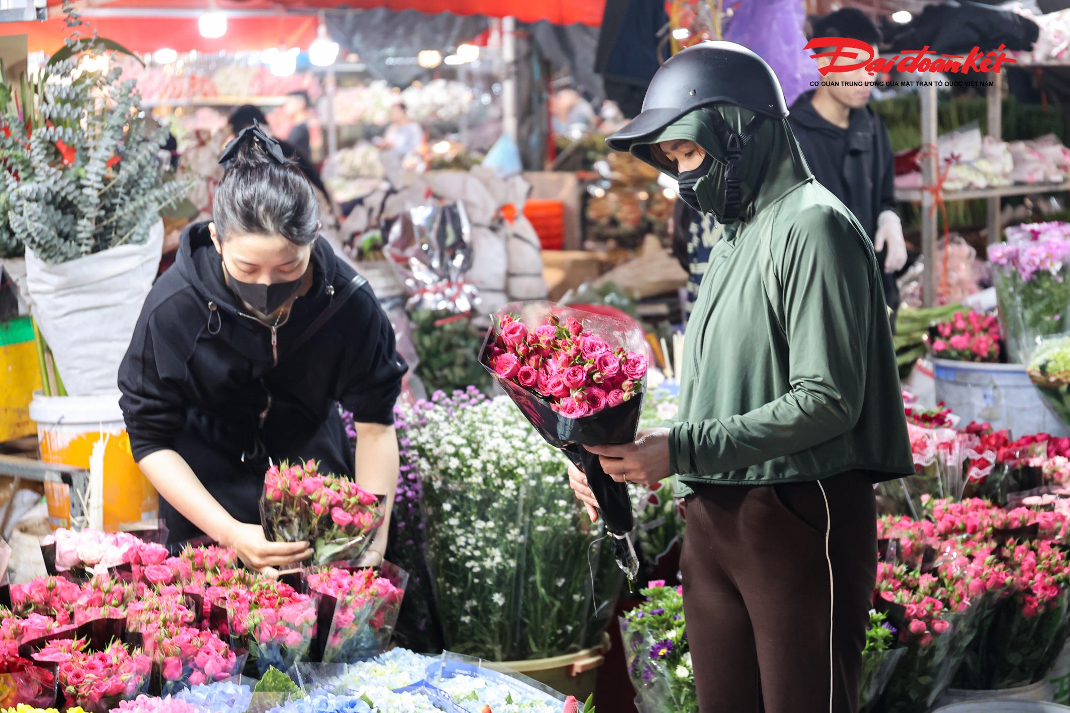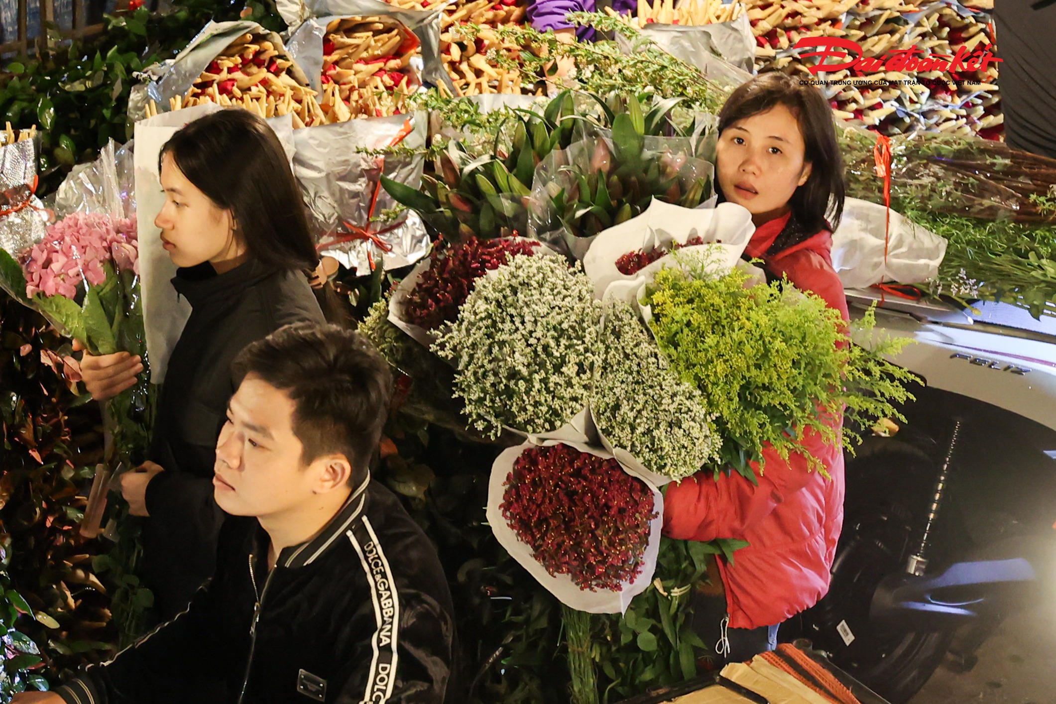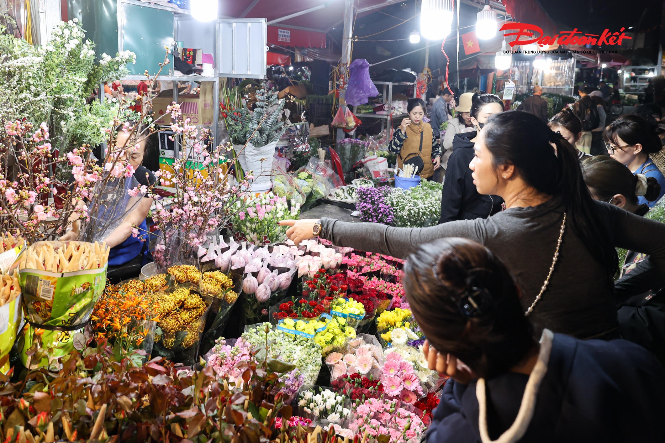 Theo ghi nhận của PV Báo Đại đoàn kết rạng sáng ngày 7/3, chợ hoa Quảng An (phường Hồng Hà, Hà Nội) trở nên rực rỡ với đủ loại hoa tươi được nhập về từ nhiều địa phương như Đà Lạt, Sơn La, Mộc Châu… Các loại hoa quen thuộc như hoa hồng, tulip, baby, ly, hướng dương được bày bán khắp các sạp, tạo nên khung cảnh đầy màu sắc giữa đêm.