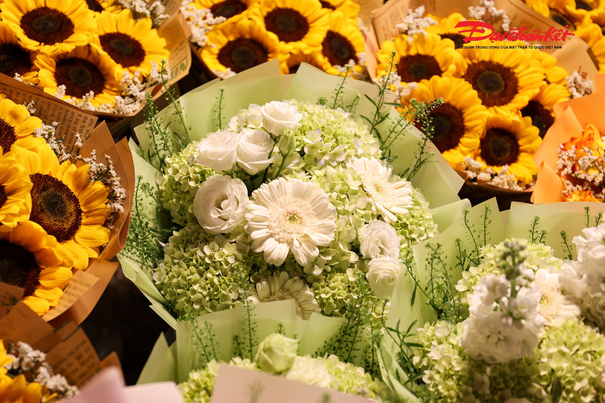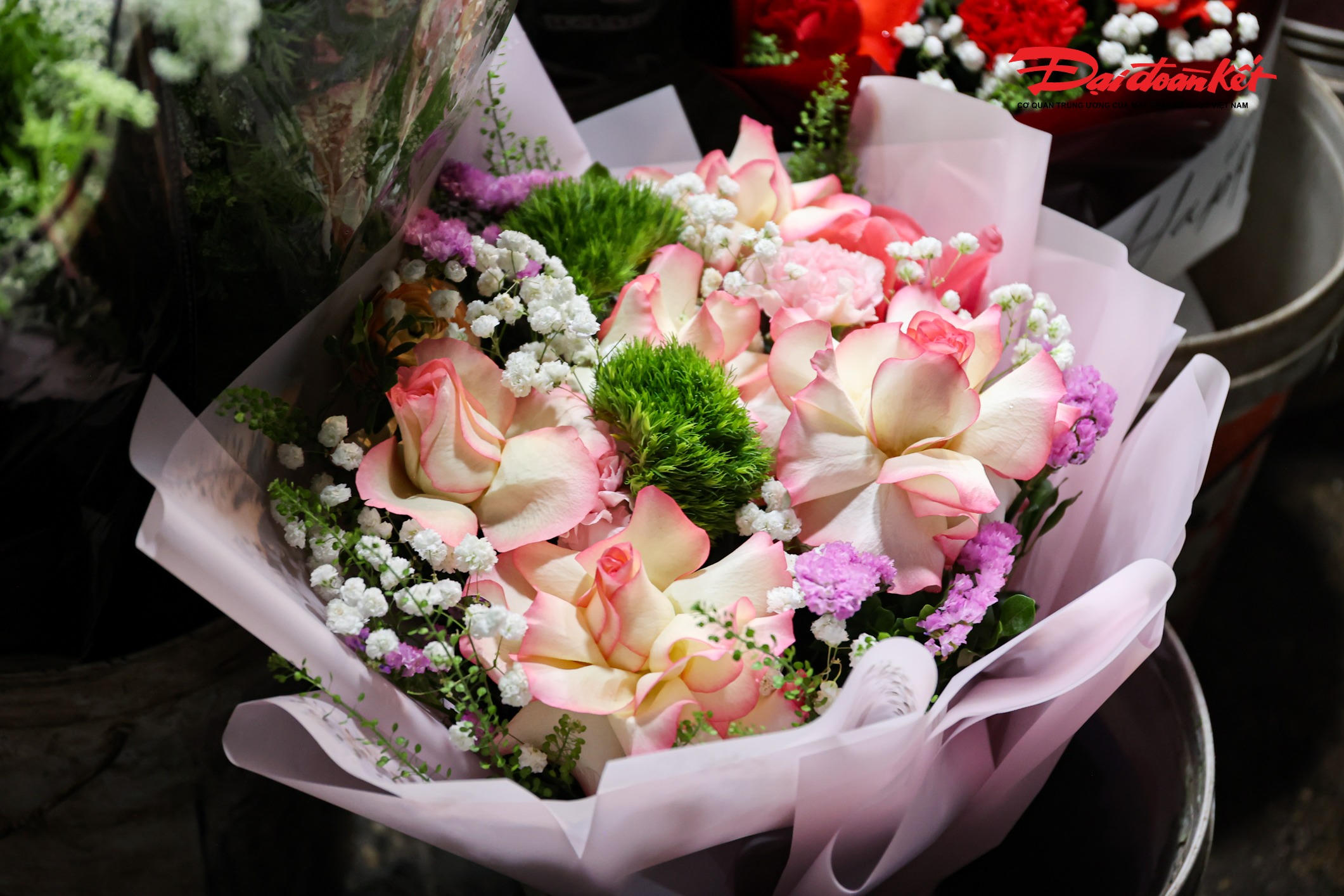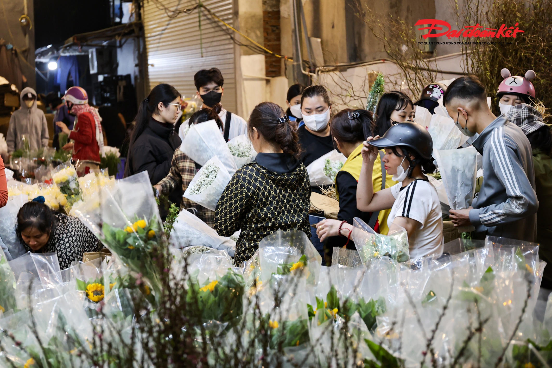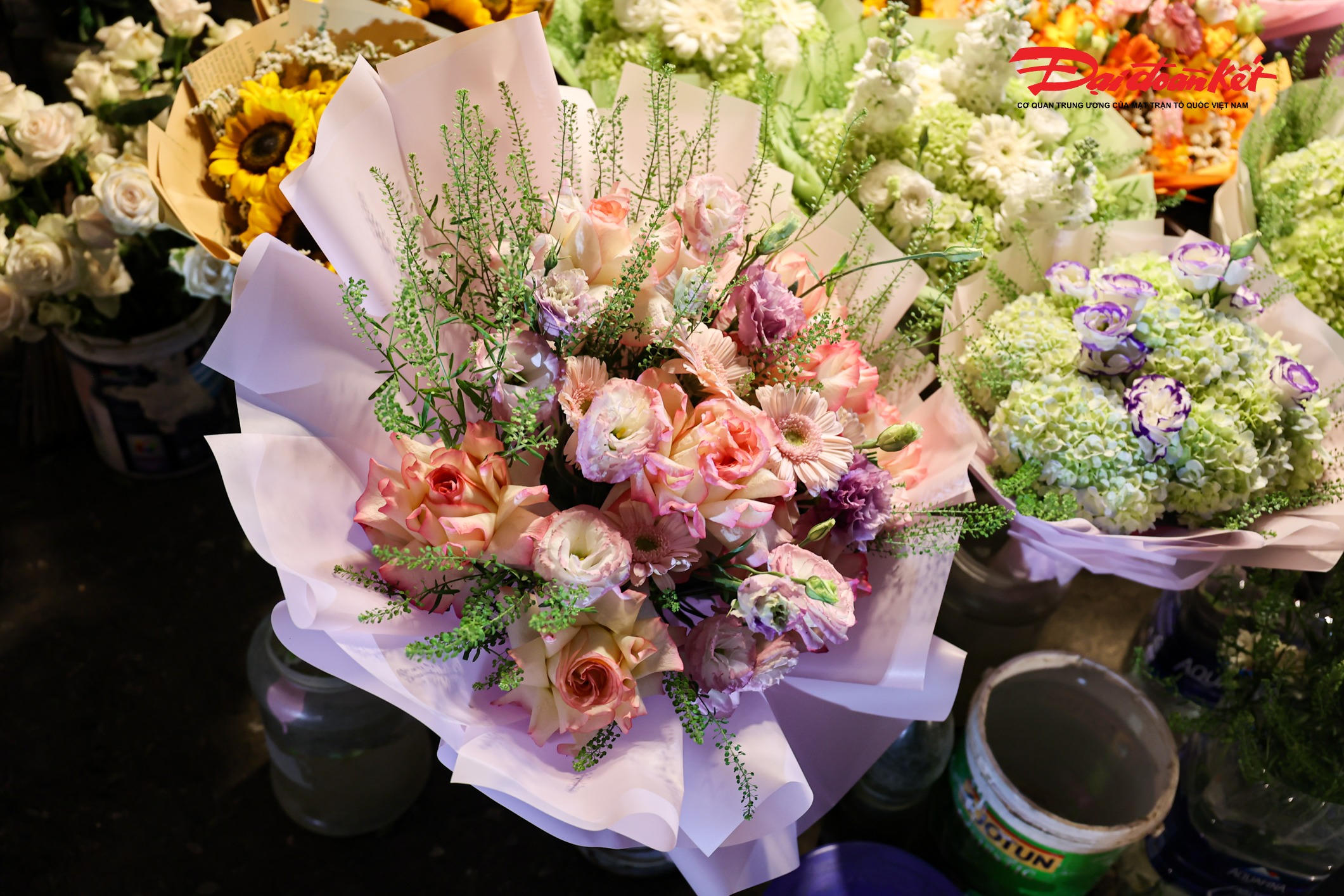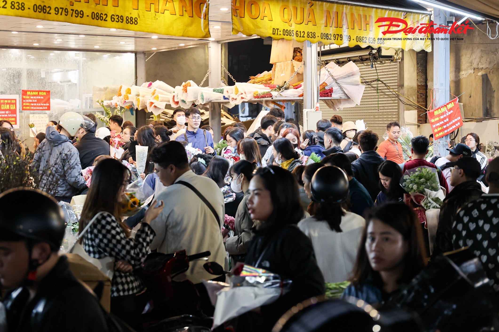 Theo ghi nhận của PV Báo Đại đoàn kết rạng sáng ngày 7/3, chợ hoa Quảng An (phường Hồng Hà, Hà Nội) trở nên rực rỡ với đủ loại hoa tươi được nhập về từ nhiều địa phương như Đà Lạt, Sơn La, Mộc Châu… Các loại hoa quen thuộc như hoa hồng, tulip, baby, ly, hướng dương được bày bán khắp các sạp, tạo nên khung cảnh đầy màu sắc giữa đêm.