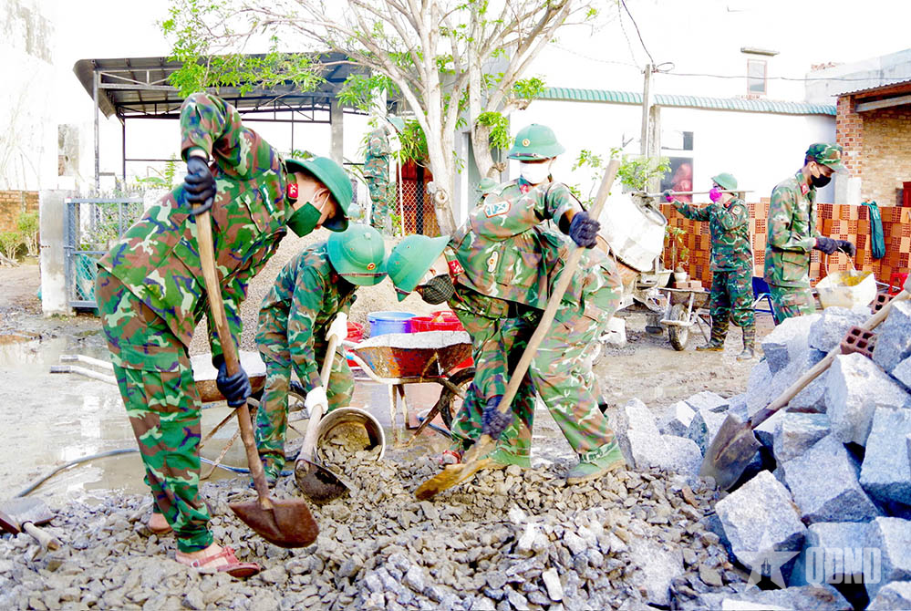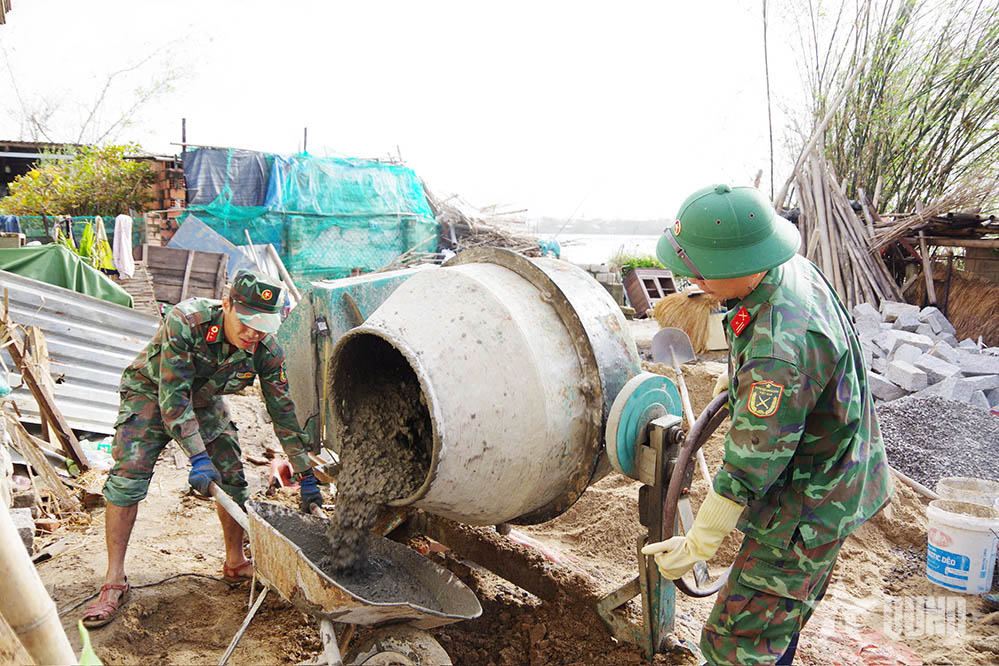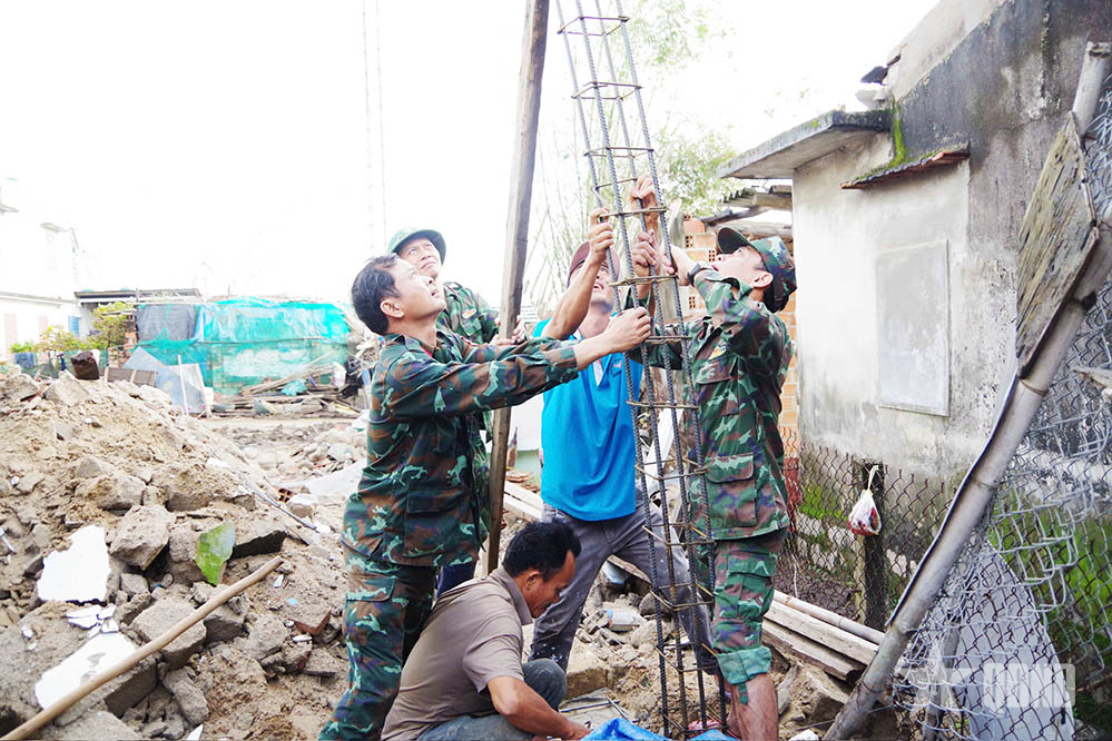 Trung tá Hoàng Đức Trung, đại diện cán bộ trực tiếp giúp dân, chia sẻ trong lúc cùng đồng đội khuân gạch: “Mỗi ngày, cán bộ, chiến sĩ bắt đầu từ sáng sớm, rút ngắn thời gian nghỉ trưa và kéo dài giờ làm việc đến khi trời sẩm tối, để đẩy nhanh tiến độ thi công. Hoàn thành sớm ngày nào, bà con đỡ vất vả ngày ấy”.