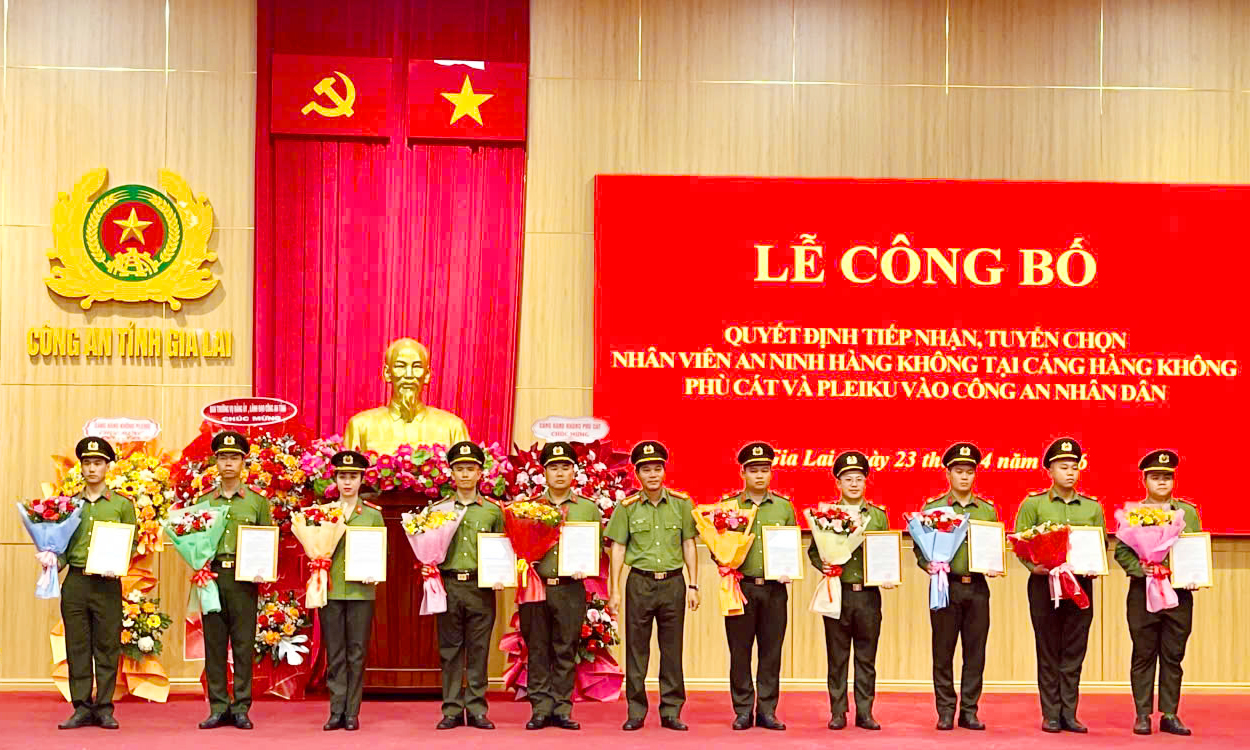 Ngày 23-4, Công an tỉnh Gia Lai tổ chức lễ công bố quyết định tiếp nhận, tuyển chọn và trao quân hàm cho 39 nhân viên an ninh hàng không đang công tác tại Cảng hàng không Phù Cát và Cảng hàng không Pleiku vào lực lượng Công an nhân dân.