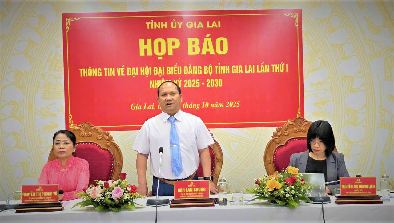 Tại buổi họp báo, ông Rah Lan Chung cho biết, Đại hội đại biểu tỉnh lần thứ I, nhiệm kỳ 2025-2030 có 450 đại biểu chính thức, trong đó đại biểu đương nhiên là 60, đại biểu chỉ định 390, đại diện cho 147.054 đảng viên trong toàn Đảng bộ. Đại hội lần này diễn ra trong 3 ngày, từ ngày 2 đến ngày 4/10, tại Trung tâm Hội nghị tỉnh, số 1 Nguyễn Tất Thành, phường Quy Nhơn, tỉnh Gia Lai.
