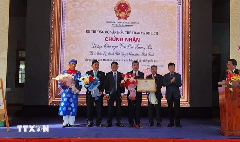 Lãnh đạo Cục Di sản văn hóa trao Bằng chứng nhận Di sản Văn hóa Phi Vật thể “Lễ hội cầu ngư vạn đầm Xương Lý” cho lãnh đạo tỉnh. (Ảnh: Sỹ Thắng/TTXVN)
