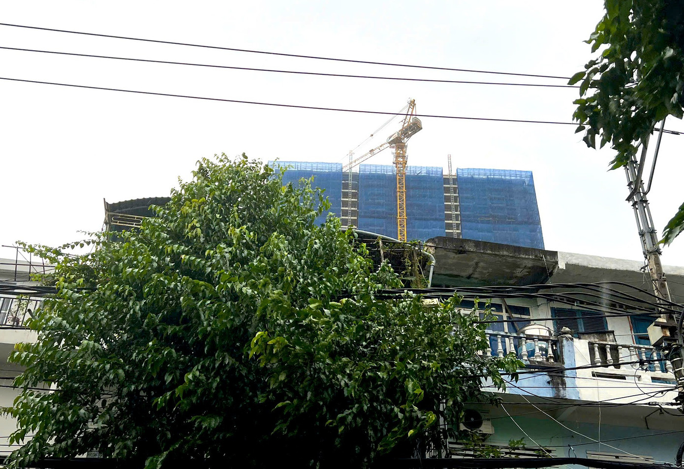 Đến 9h ngày 6/11, chiếc cần cẩu vẫn án ngữ trên tòa nhà khu vực phường Quy Nhơn, tiềm ẩn nguy hiểm.