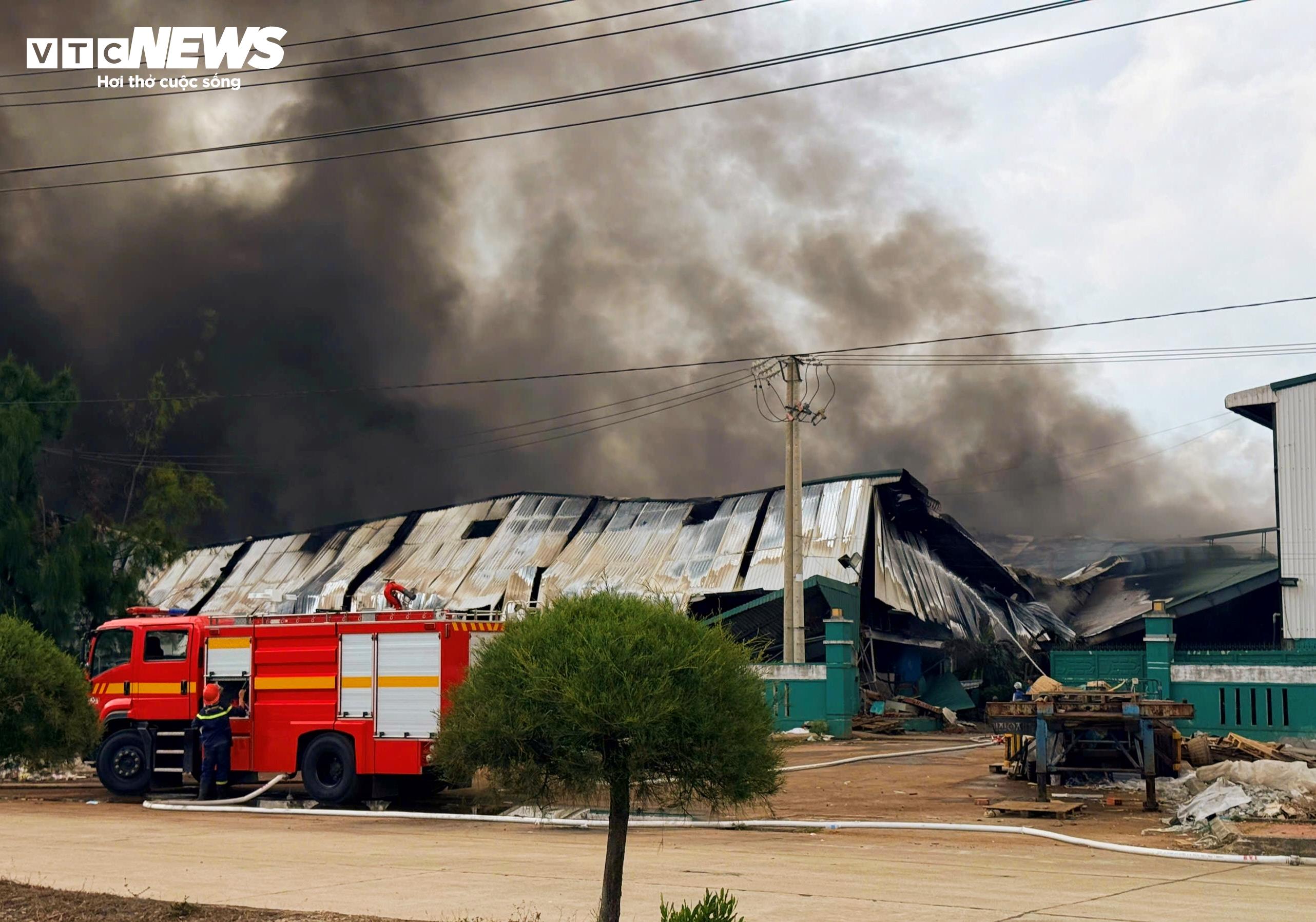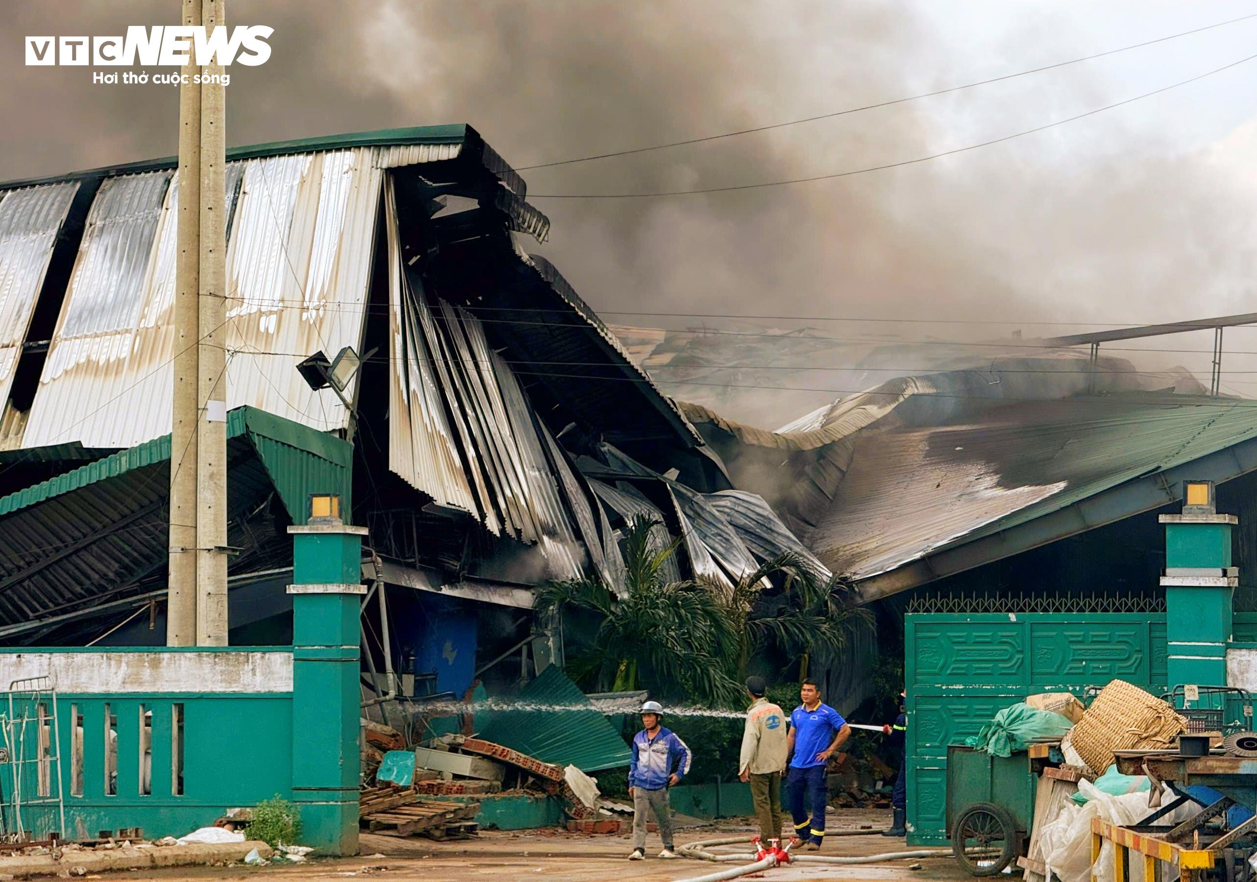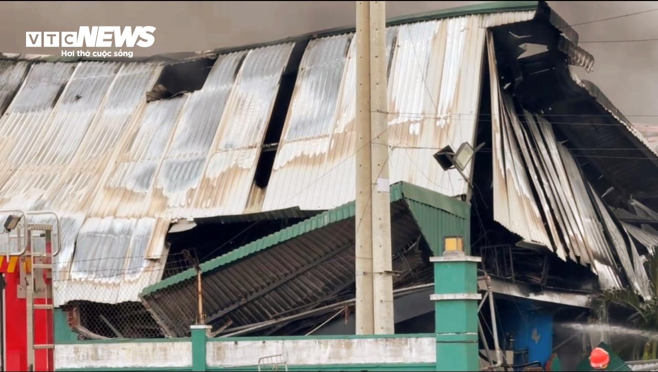 Nhà máy, nơi xảy ra vụ cháy trong tình trạng vẫn đang cháy, sập mái.