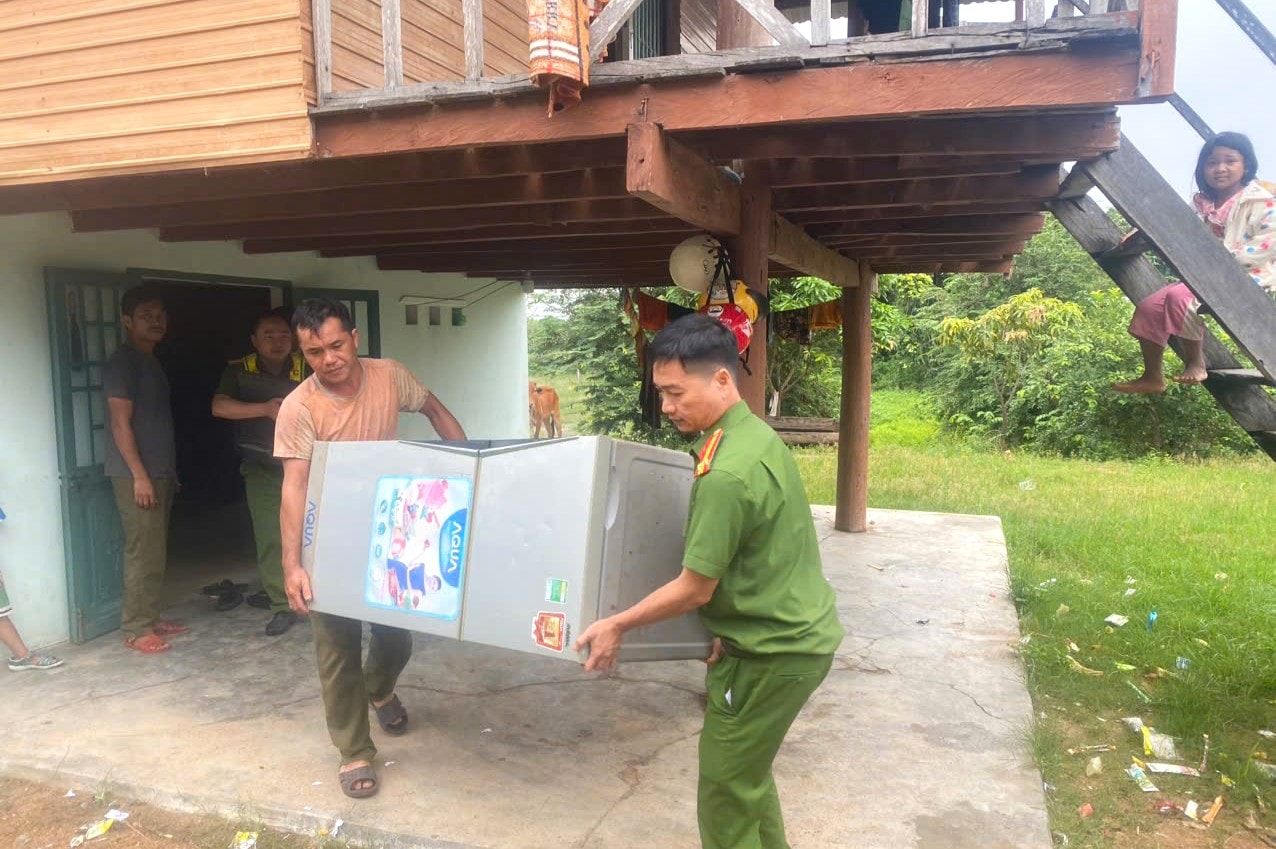 Lực lượng công an hỗ trợ người dân xã Ia Sao chằng chống nhà cửa, di dời tài sản