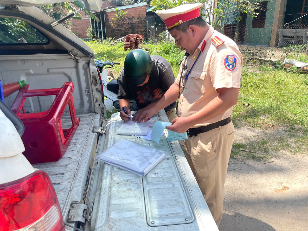 Sau khi thông báo lỗi “vượt đường ngang khi đèn đỏ bật sáng”, các chiến sĩ CSGT vừa lập biên bản, vừa tuyên truyền, giải thích để ông P. nhận thức rõ mức độ nguy hiểm của hành vi vượt đường sắt khi đèn đỏ và gác chắn đang hạ.