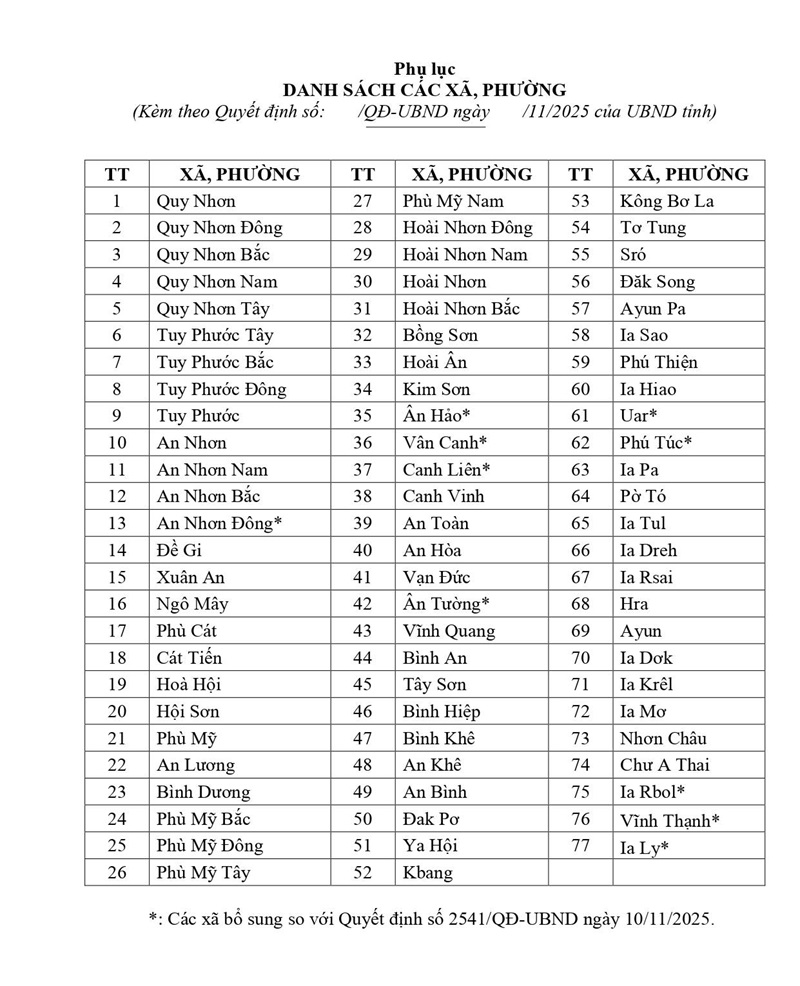 Phạm vi ảnh hưởng tại 77 xã, phường trên tổng số 135 xã, phường của tỉnh (bao gồm 65 xã, phường đã được công bố tại quyết định ngày 10/11/2025). Các xã, phường bổ sung gồm phường An Nhơn Đông; các xã Ân Hảo, Vân Canh, Canh Liên, Ân Tường, Uar, Phú Túc, Ia Rbol, Vĩnh Thạnh và Ia Ly.