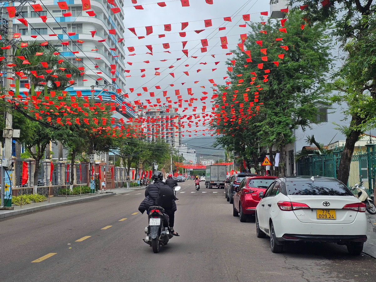 Trên các tuyến phố, hàng ngàn lá cờ nhỏ kết thành dải đỏ kéo dài thẳng tắp, đan xen trong gió biển mát lành. Buổi sớm, khi nắng xuân còn dịu, sắc đỏ nổi bật trên nền trời trong xanh, phản chiếu xuống mặt đường.
