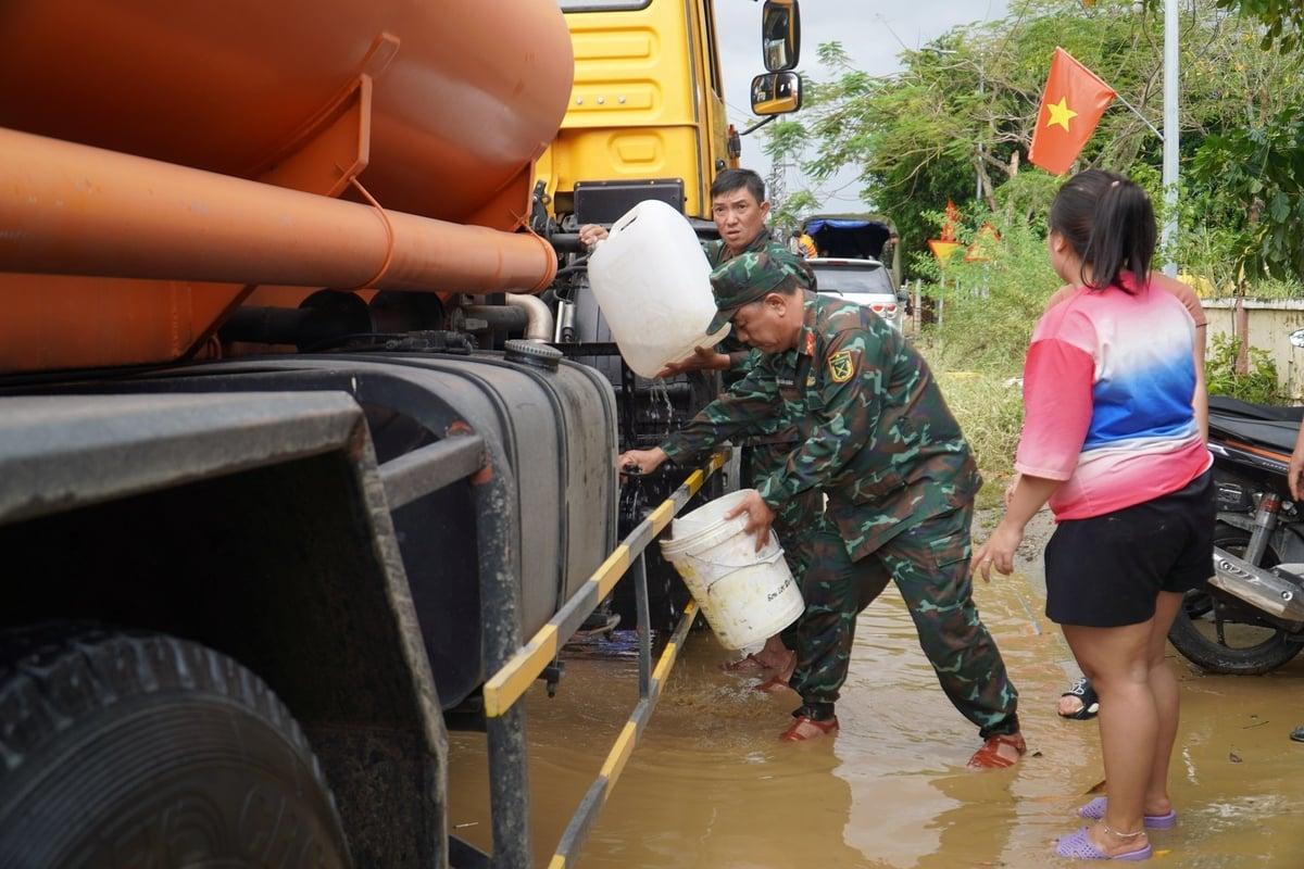 Bộ đội chở nước sạch cho người dân vùng ngập lụt ở xã Diên Điền, tỉnh Khánh Hòa. Ảnh Báo Nông nghiệp và Môi trường