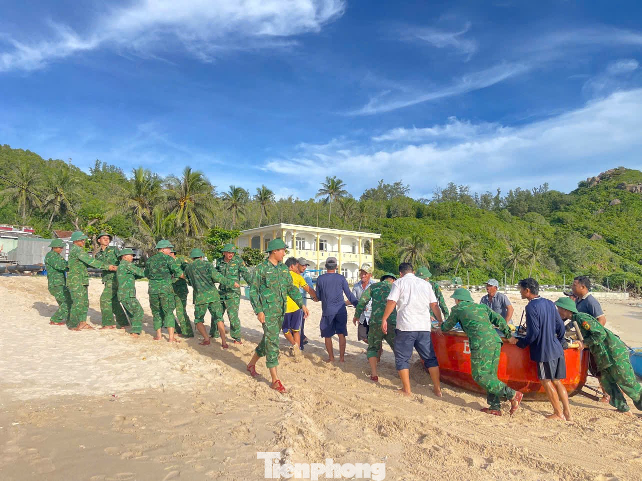 Hỗ trợ di chuyển thuyền thúng lên cao. Ảnh: Công Cường