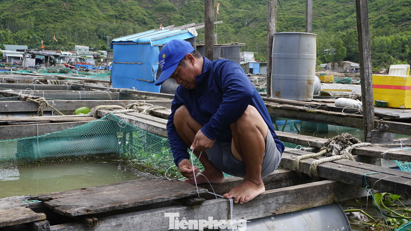 Người dân tiến hành gia cố lại lồng bè nuôi thủy sản để bảo vệ tài sản. Ảnh: Trương Định