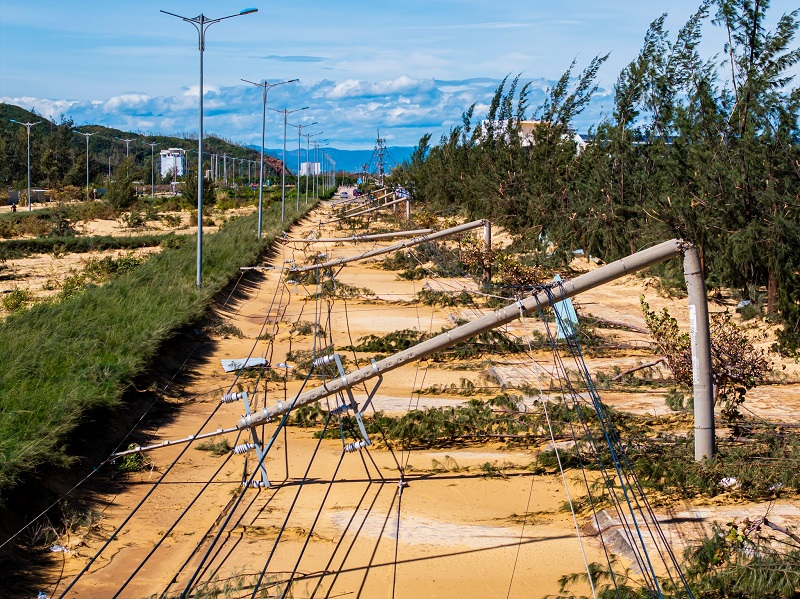 Cảnh tan hoang trên tuyến đường qua Khu kinh tế Nhơn Hội sau khi bão số 13 đổ bộ. Ảnh: Dũng Nhân.