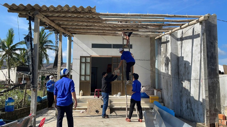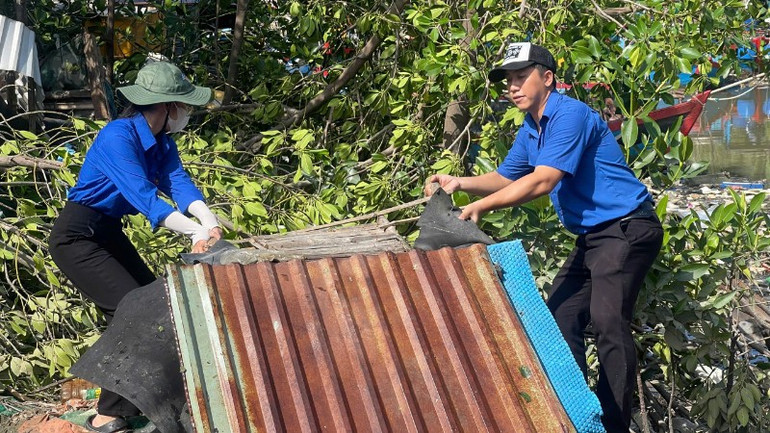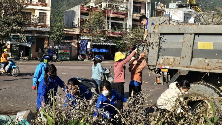 Đoàn viên thanh niên giúp người dân dọn bùn đất sau bão.