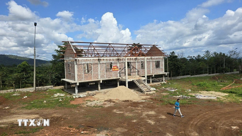 Công trình Nhà rông tại làng Ia Gri, xã Biển Hồ, tỉnh Gia Lai đã tạm ngừng thi công theo chỉ đạo của lãnh đạo tỉnh Gia Lai để rà soát, đánh giá tính phù hợp của thiết kế và vật liệu xây dựng. (Ảnh: Hồng Điệp/TTXVN)