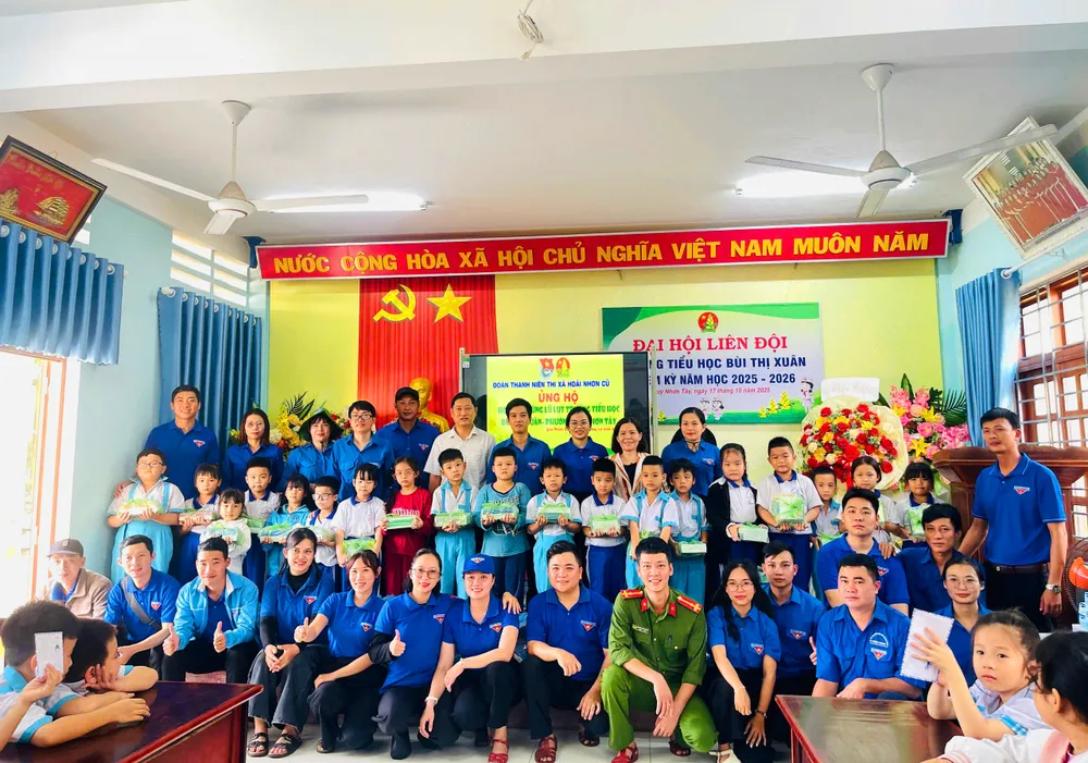 Đoàn thanh niên tham gia hỗ trợ, trao nhiều phần quà cho học sinh vùng lũ.