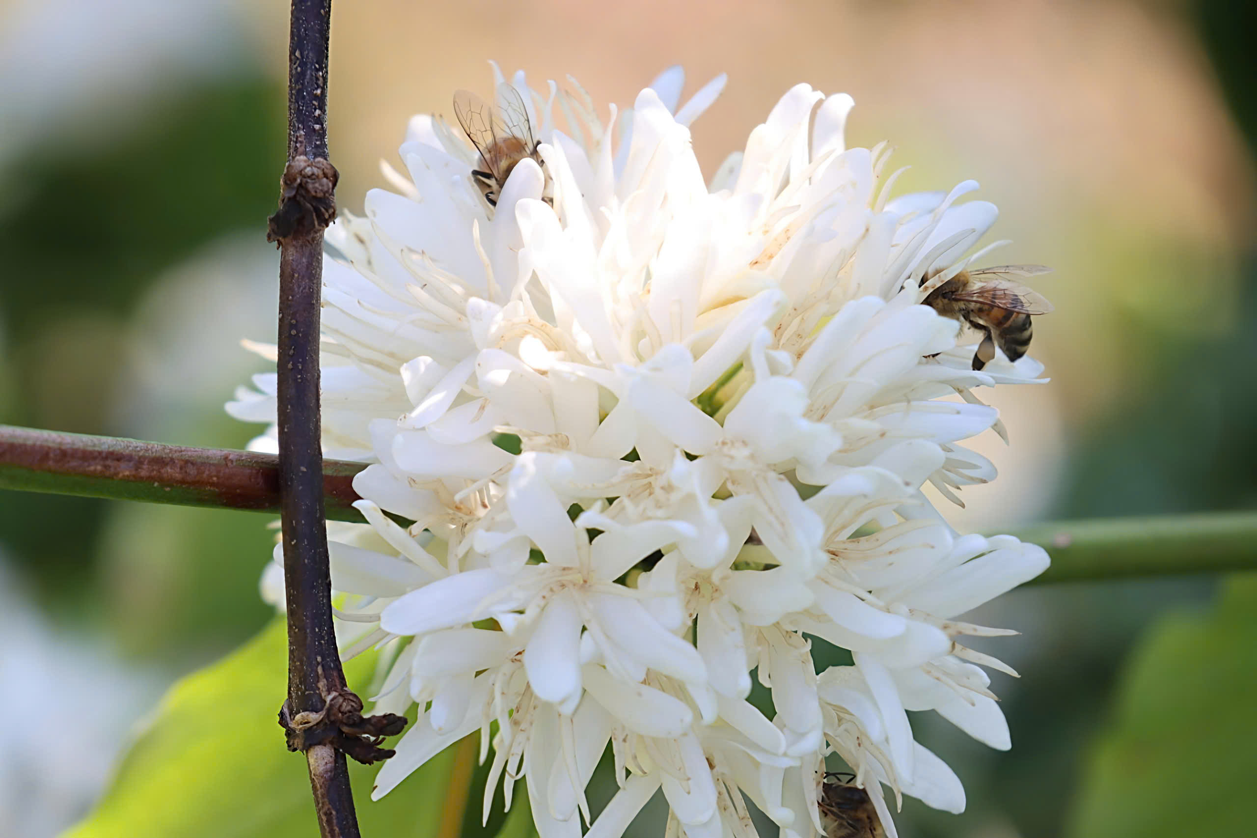 Dưới nắng cao nguyên, từng chùm hoa cà phê trắng muốt phủ kín cành, nổi bật trên nền xanh của tán lá và bầu trời trong vắt. Hương hoa dìu dịu lan tỏa, thu hút từng đàn ong mật bay về cần mẫn hút mật, làm vườn cà phê thêm phần sinh động, rộn ràng.