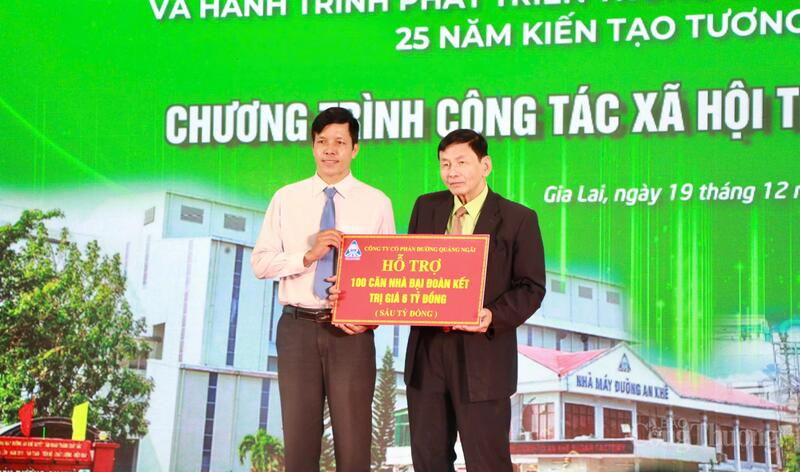 Ông Võ Thành Đàng, Tổng Giám đốc Công ty Cổ phần Đường Quảng Ngãi thay mặt Công ty trao biểu trưng hỗ trợ 100 căn nhà Đại đoàn kết trị giá 6 tỷ đồng cho tỉnh Gia Lai. Ảnh: Hiền Mai