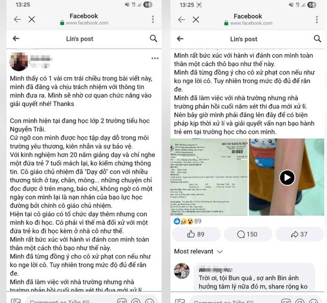 Bài đăng của bà L trên mạng xã hội tố giáo viên chủ nhiệm đánh con trai lớp 2. (Ảnh: chụp màng hình MXH)