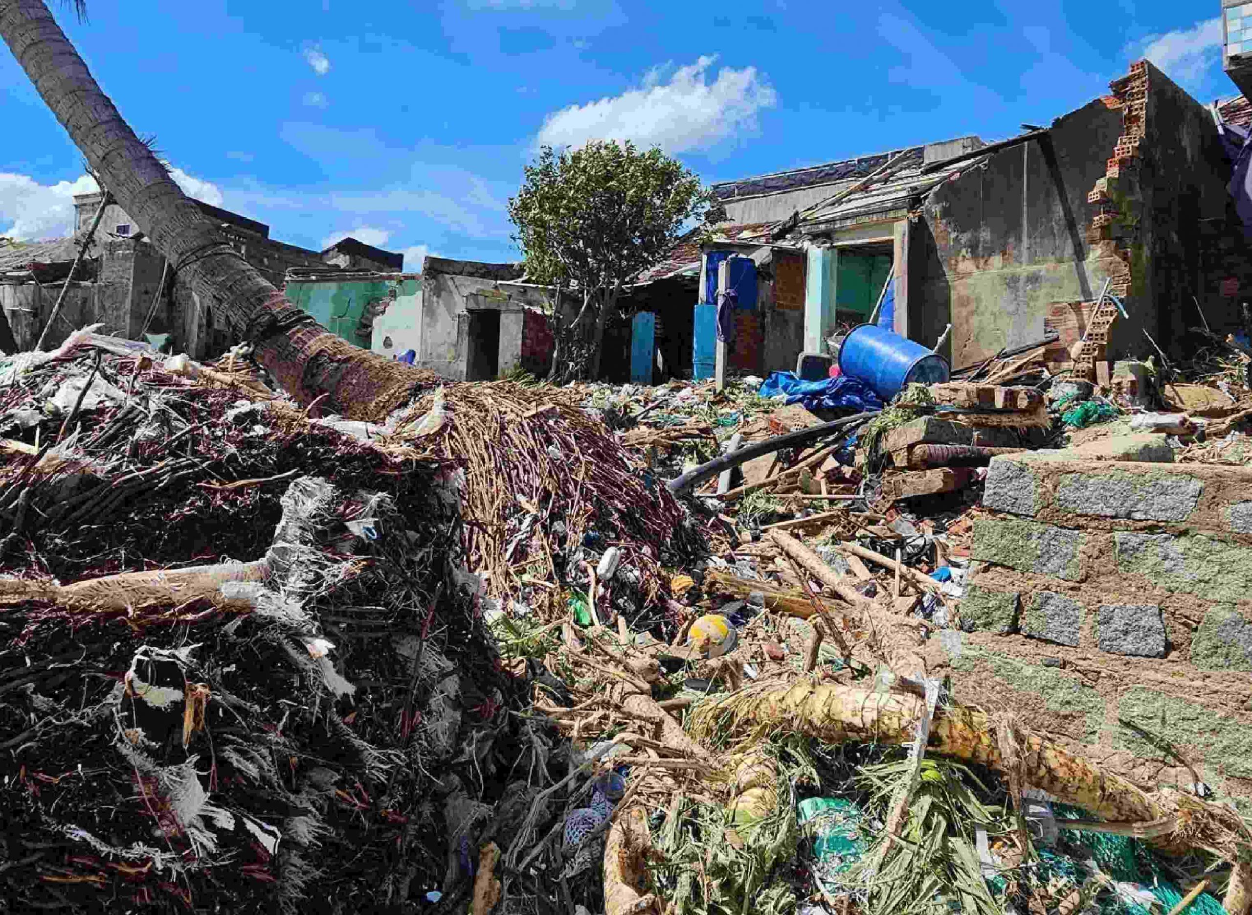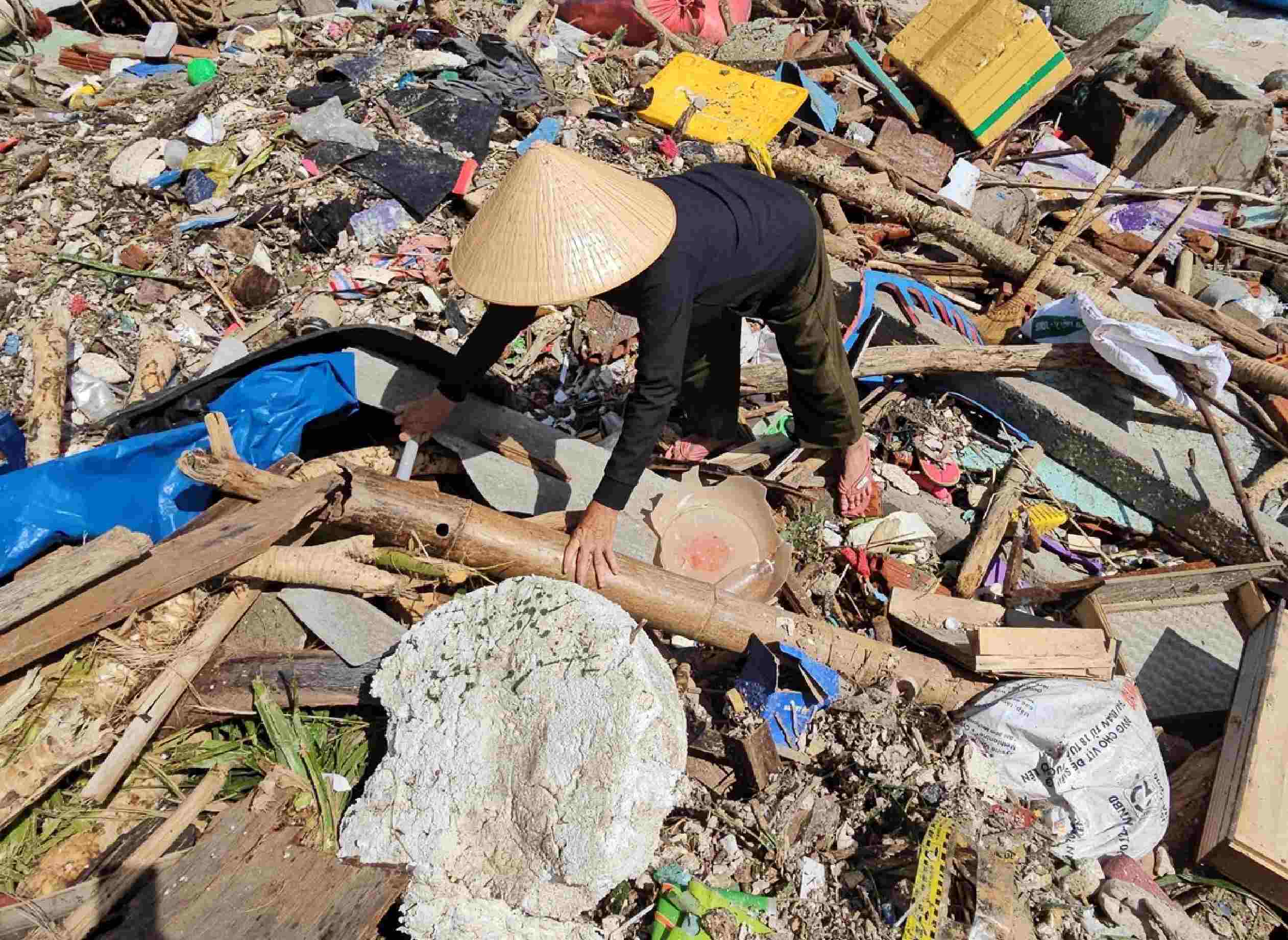 Người dân làng chài Xuân Thạnh đang dọn dẹp lại đống đổ nát sau bão. Ảnh: Tiêu Dao – Quách Tài
