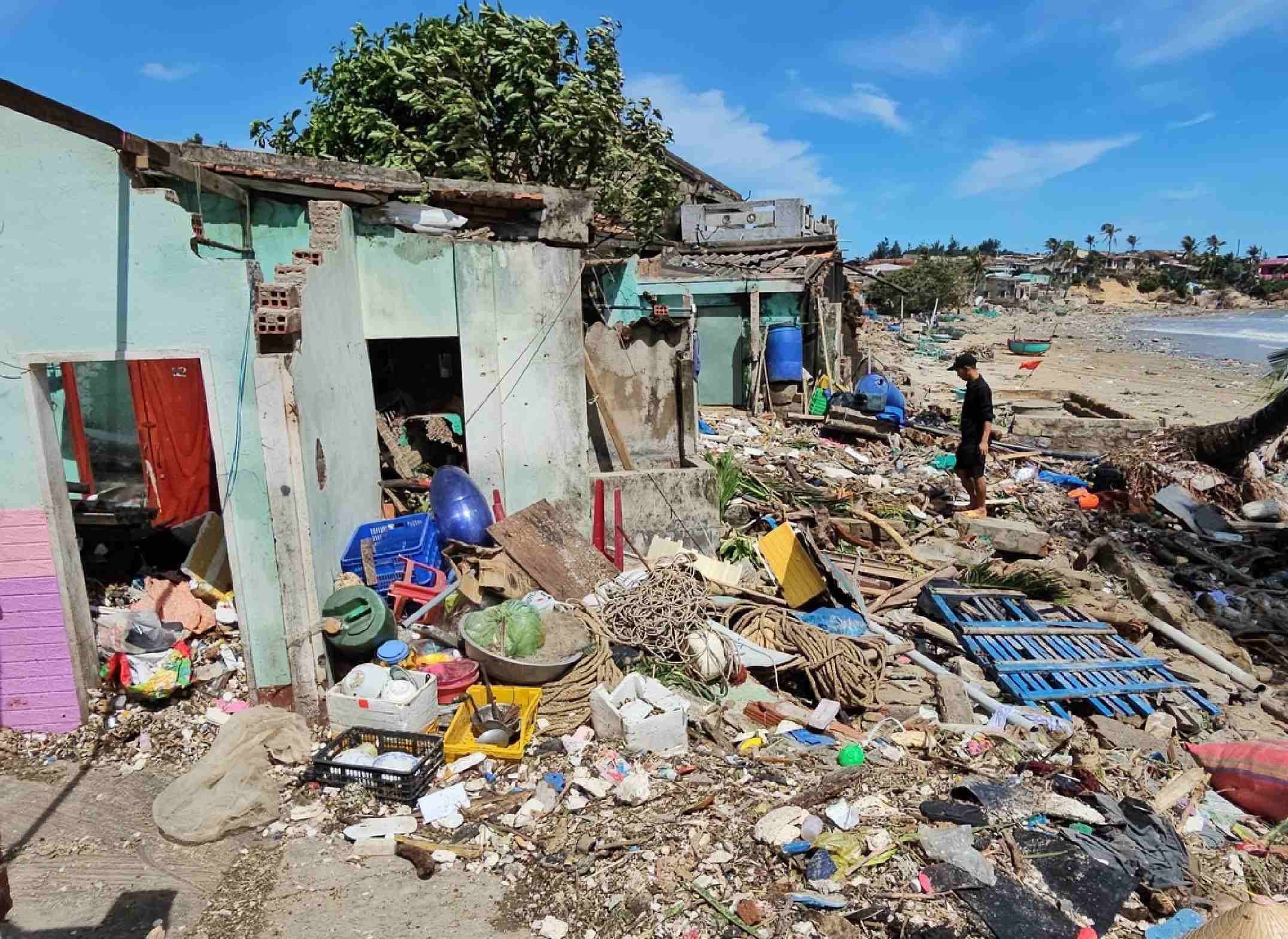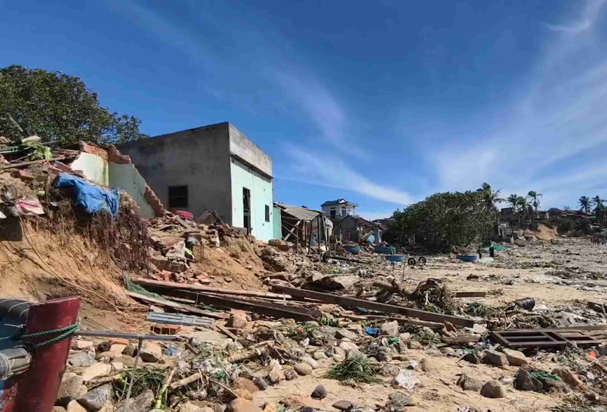 Đêm bão đổ bộ, gió mạnh và sóng lớn đã quét qua các làng ven biển từ Quảng Ngãi đến Đắk Lắk. Tại làng chài Xuân Thạnh (xã Phù Mỹ Đông, tỉnh Gia Lai), sóng đánh sâu vào khu dân cư, cuốn trôi hàng chục ngôi nhà ven biển. Ảnh: Tiêu Dao – Quách Tài