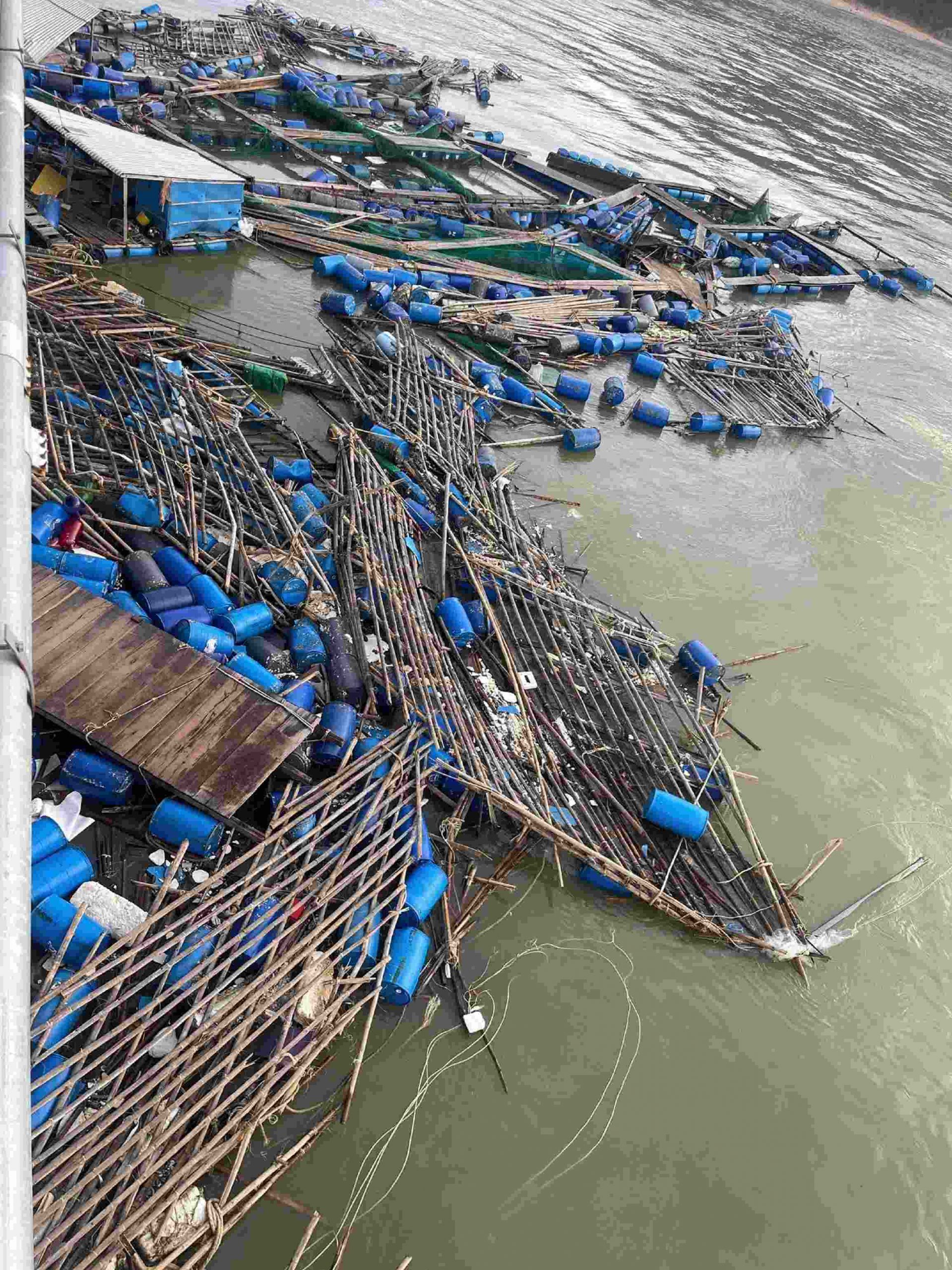Báo cáo nhanh của Ban Chỉ huy Phòng thủ dân sự tỉnh cho biết có khoảng 54.000 lồng bè bị hư hại, ước tính thiệt hại khoảng 21 tỉ đồng. Ảnh: Tiêu Dao – Quách Tài