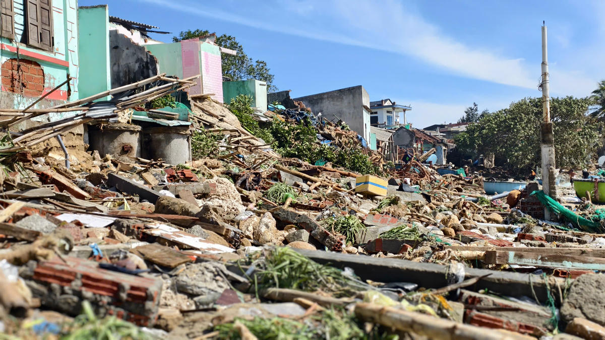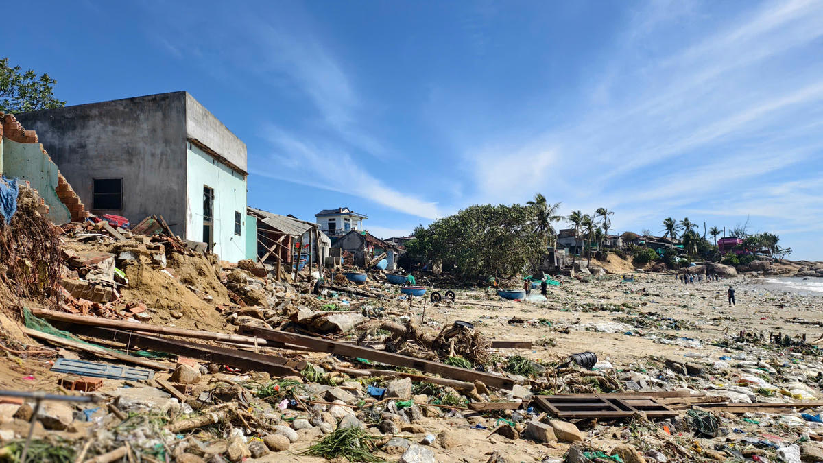 Theo ghi nhận của PV, lúc 12h trưa cùng ngày, sóng biển dâng cao liên tục ập vào khu dân cư hướng mặt biển, cuốn theo từng mảng tường, mái tôn và đồ đạc của người dân ra xa bờ. Nhiều căn nhà bị đánh hư hại nặng, trong đó có không ít nhà bị sập hoàn toàn, khiến người dân bàng hoàng, xót xa khi trở lại sau khi bão tan.