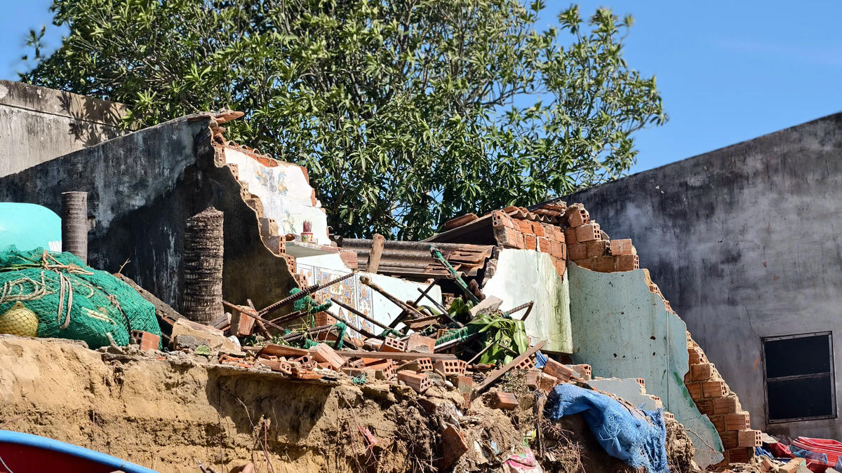 Một ngôi nhà sập đổ hoàn toàn ở làng chài Xuân Thạnh. Ảnh: Đình Sang.