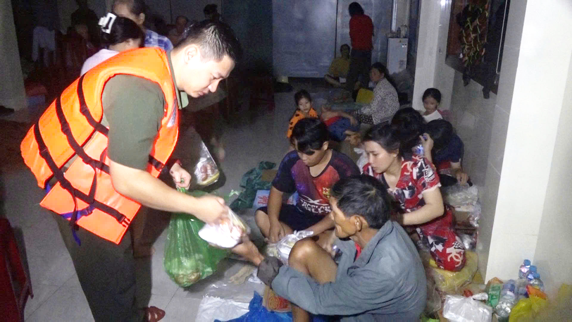 Phát cơm hộp cho người dân có nhà bị ngập phải sơ tán khẩn cấp