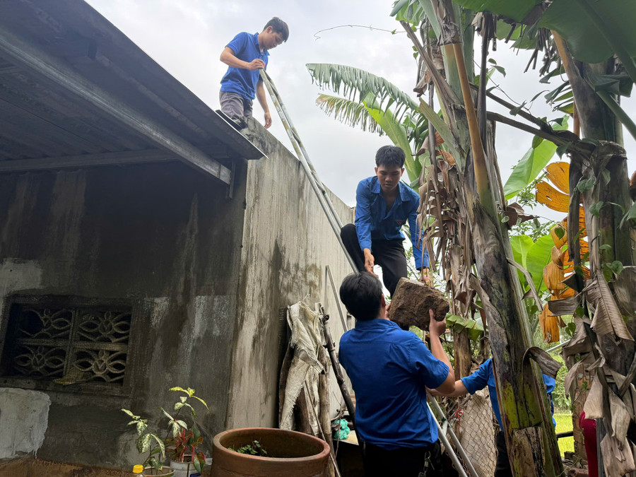 Đoàn Thanh niên xã Tuy Phước phối hợp cùng Chi đoàn thôn Phổ Trạch giúp người dân gia cố nhà cửa trước khi cơn bão số 13 đổ bộ. Ảnh: D.L