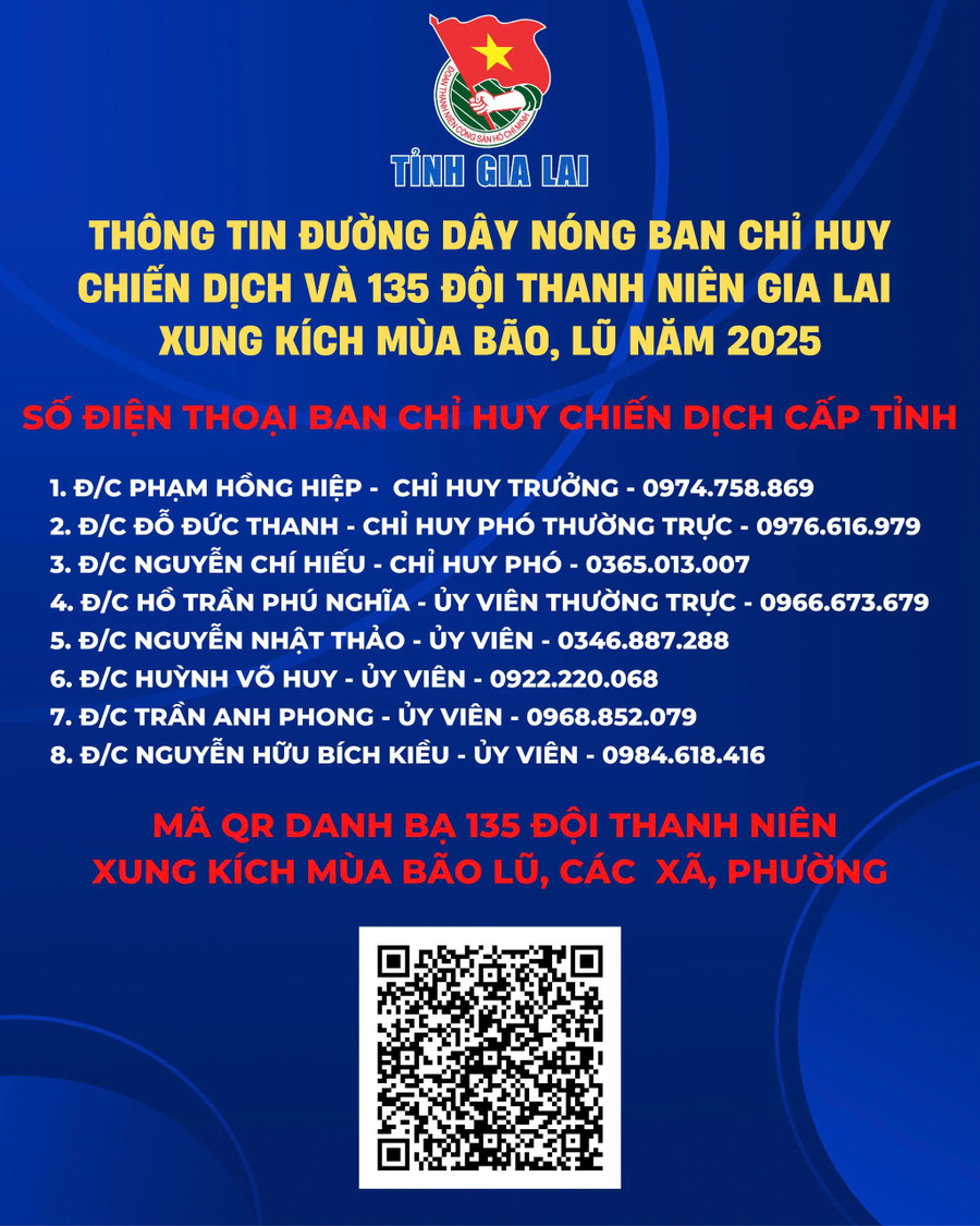 Cụ thể, Tỉnh đoàn đã công bố đường dây nóng Ban Chỉ huy chiến dịch cấp tỉnh và danh bạ 135 đội thanh niên xung kích mùa bão, lũ năm 2025 ở các xã, phường qua mã QR để kết nối thông tin, điều lực lượng khi có tình huống khẩn cấp.