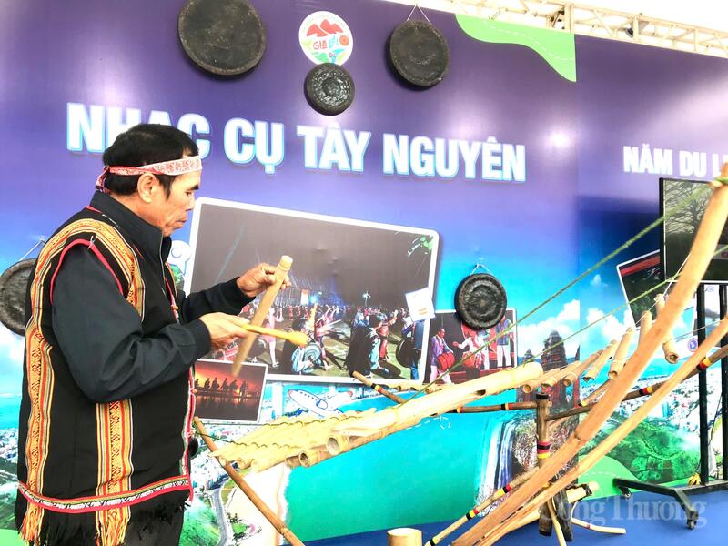 Các nghệ nhân giới thiệu dụng cụ âm nhạc Tây Nguyên. Ảnh: Hoa Quỳnh