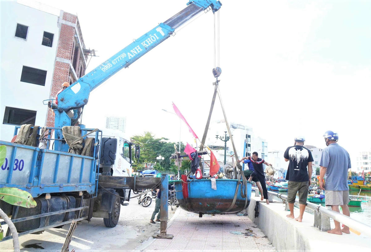 Ngư dân thuê xe cầu ghe lên bờ tránh trú bão số 13 tại cảng Quy Nhơn. Ảnh: T.Thành.