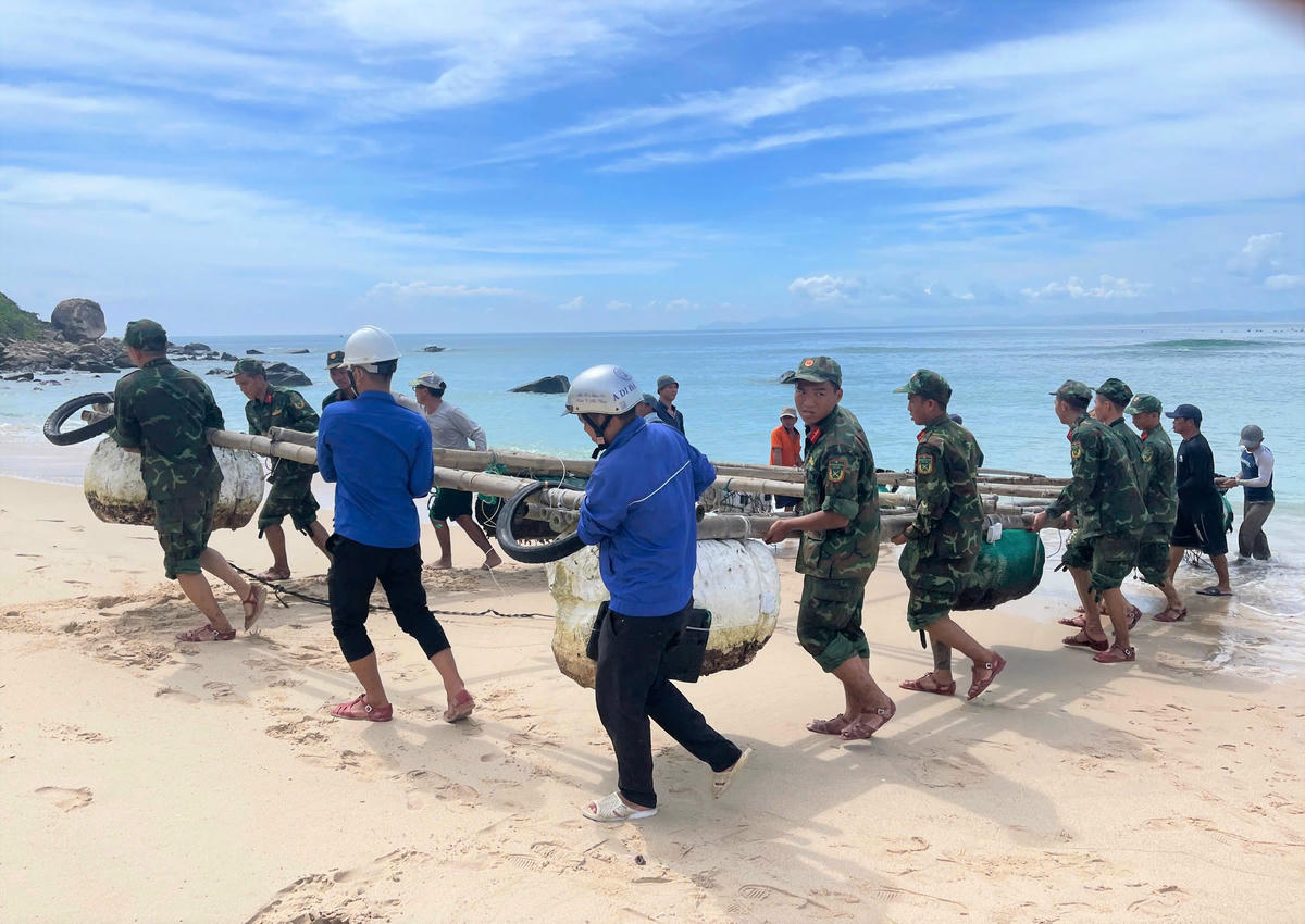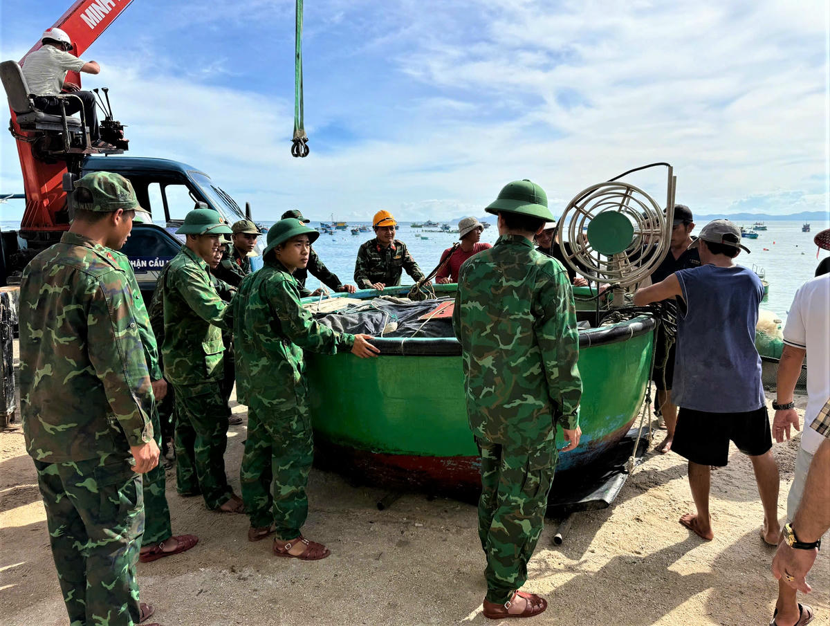 Lực lượng quân đội, biên phòng tỉnh Gia Lai giúp ngư dân di chuyển ghe thuyền lên bờ. Ảnh: T.Thành.